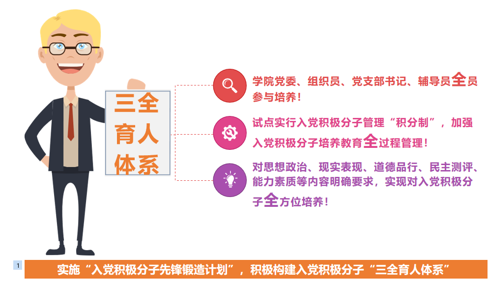 学院将入党积极分子的教育、培养和管理纳入党建重要内容,积极构建入党积极分子“三全育人体系”。建立健全学院党委、组织员、党支部书记、辅导员全员参与入党积极分子教育管理的网络,有效解决入党积极分子脱离党组织、疏于管理、难于管理的现象;试点实行入党积极分子管理“积分制”,推行政治素养一票否决制,明确基础达标项,对评奖评优项量化积分,实行清退制度,加强入党积极分子培养教育全过程管理;对思想政治、现实表现、道德品行、民主测评、能力素质等内容明确要求,重视实践教育,实现入党积极分子全方位培养。
