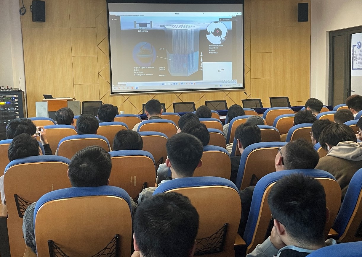田新亮副教授通过介绍中微子的科学意义以及中微子的探测原理,对比欧洲、俄罗斯、加拿大等国家的探测方案,引入到由上海交通大学牵头的“海铃计划”,进而向在座师生讲授了“海铃计划”南海中微子望远镜的选址、实施方案,重点介绍了“海铃计划”的阶段性进展,包括海底平整度扫描、全海深水文剖面扫描、海水散射性质测量、四季浮标布置,并通过“海铃计划”探路者的海试视频,让在座师生直观地了解到整个出海航行科研工作。同时,田新亮教授还介绍了最新的工作进展和工程挑战,表示“海铃计划”作为一个前所未有的大工程,将为人类探索宇宙提供巨大的想象空间。