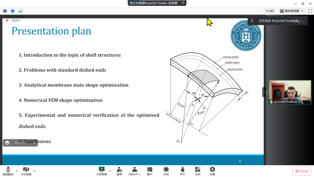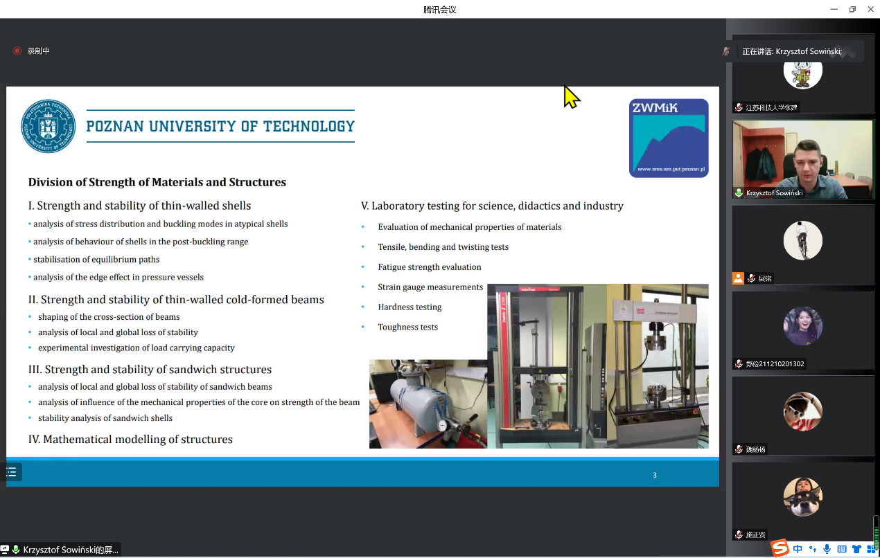 2022年12月1日下午3:30,浪live 船海机械大讲堂第3讲如期举行,波兹南理工大学机械工程专业研究员Krzysztof Sowinski博士应邀作了题为“Optimization of dished ends of cylindrical pressure vessels”的线上讲座。本次讲座由浪live 副院长张建教授主持,学院200多名师生参加。