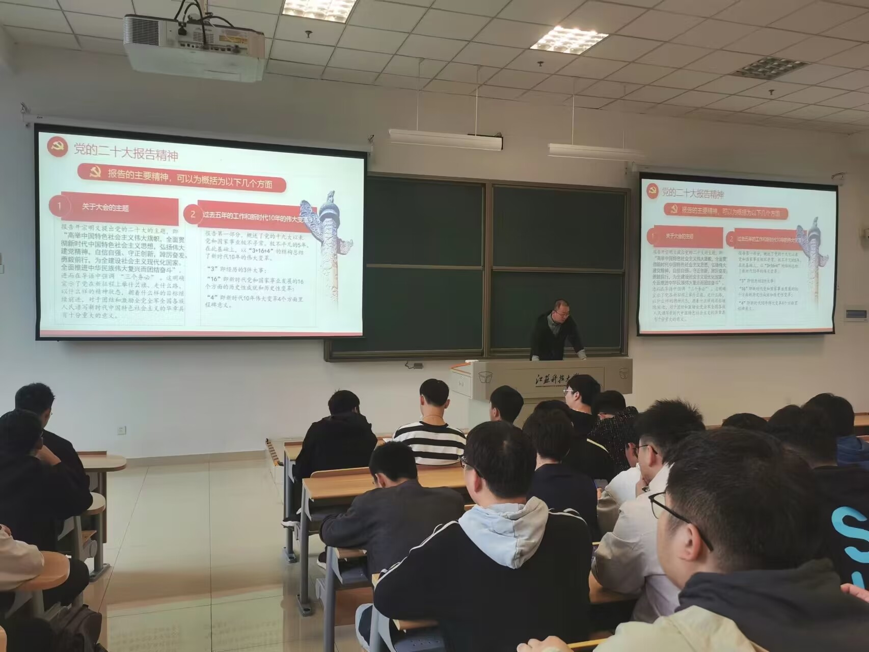 学院党委副书记谭海波、专职辅导员谭静为学生领学党的二十大报告。结合高等教育、学校发展、专业前景、青年使命等重点篇章展开详细讲解,教育引导学生深刻领悟“两个确立”的决定性意义,不断增强“四个意识”、坚定“四个自信”、做到“两个维护”。