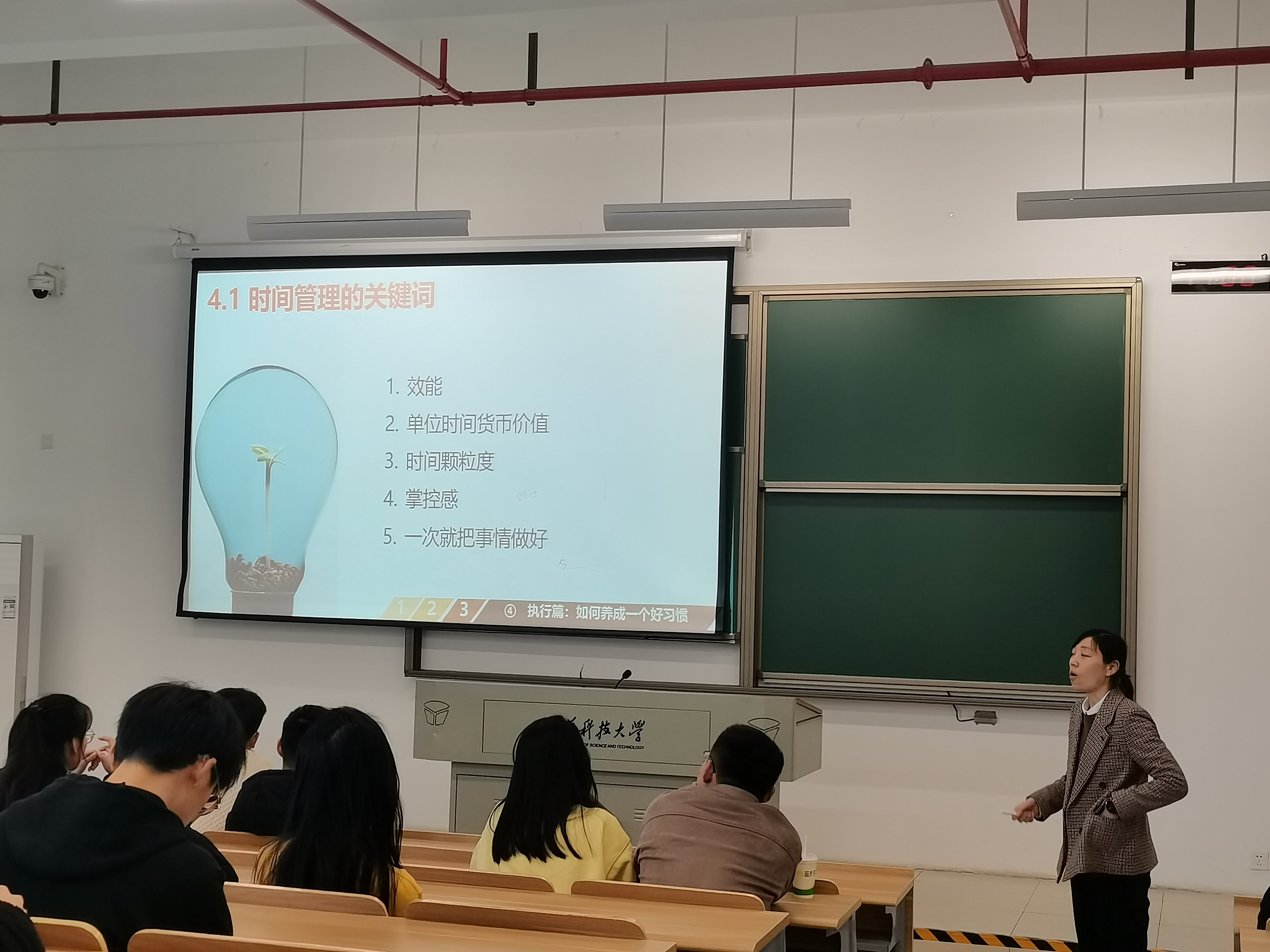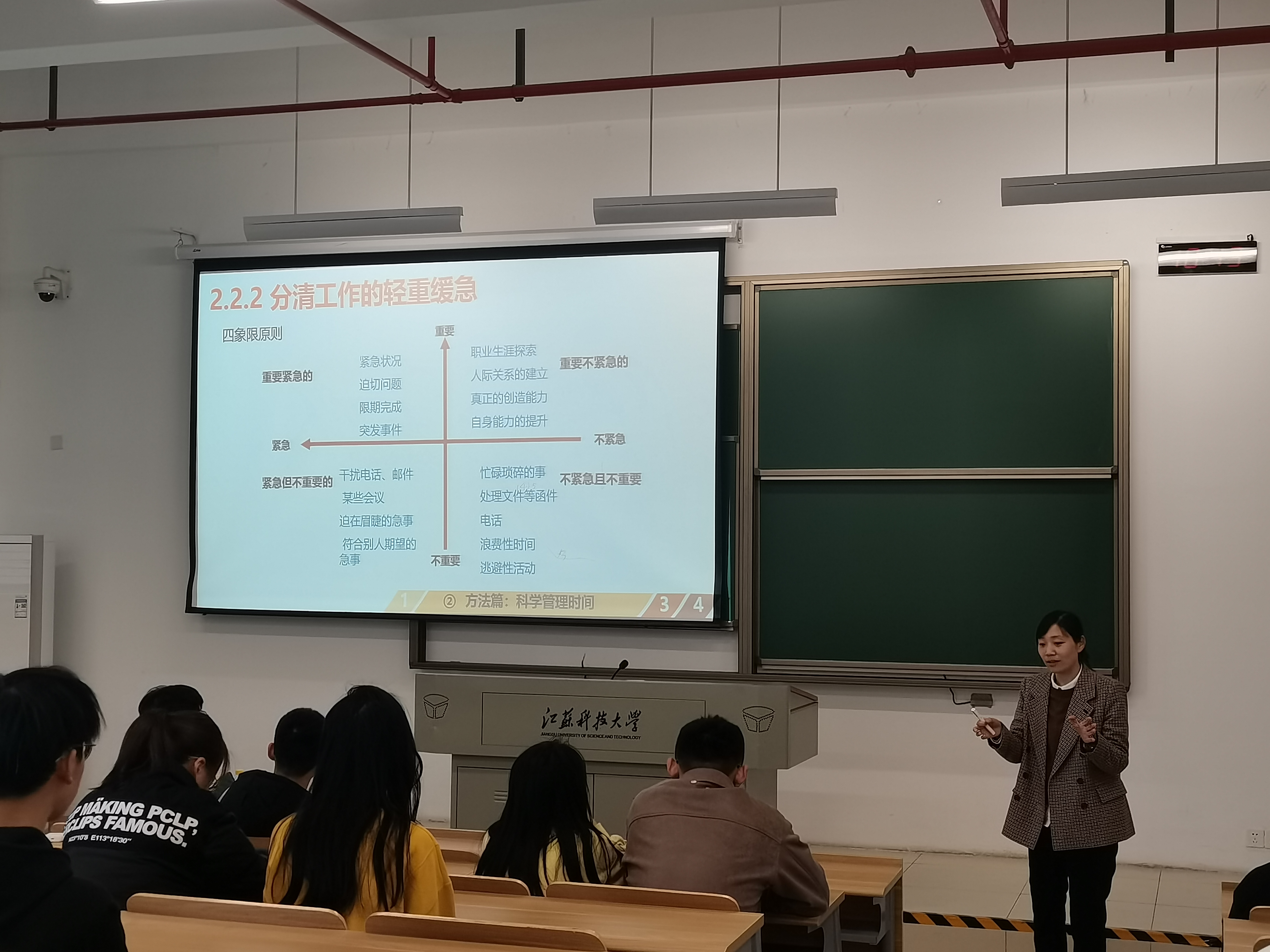 谢老师从“你的时间去哪儿了”“科学管理时间的方法”“行动时遇到问题怎么办”“如何养成一个好习惯”四方面讲解。首先,谢老师首先通过“你是否有时间管理不良的征兆”的小测试让同学们对自身时间管理有一定判断。并且,谢老师还介绍了帕累托原则、时间管理四象限和麦肯锡时间分配法等时间管理原则,提出以正确的方式做事就是效率,确保不做无用功,专注做好一件事更重要。