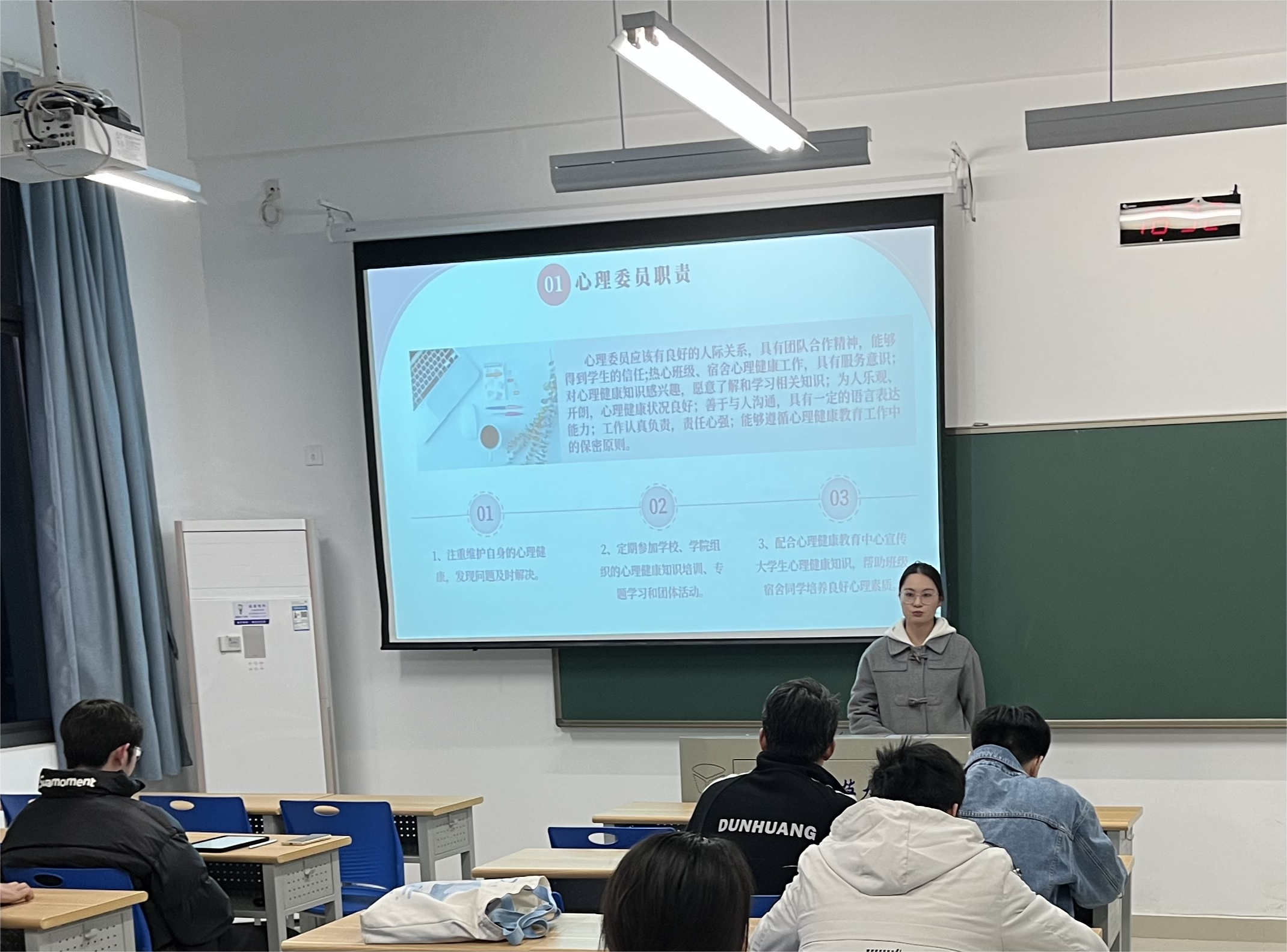 谭静首先宣布了本学年“重塑心秩序,青春再起航”大学生心理健康教育主题,提出了相关主题的大学生心理健康教育系列校级作品征集活动、第七届“世说新语”心理情景剧大赛院内选拔赛的要求,并给心理委员布置了任务。随后,对心理委员提出了三点工作要求:一是要积极发挥心理委员的主观能动性,形成主动观察、及时反馈的良好工作交流机制;二是要加强心理健康教育工作与班集体的联系,形成多元组织、共建共促的心理健康特色循环;三是要提升心理健康教育队伍的专业素养,以更好地主动协同、高效配合学校和学院开展心理知识普及宣传工作。希望各班级心理委员能够做到时刻与同学同在,及时发现问题,解决问题,维护心理健康,共创美好大学生活。