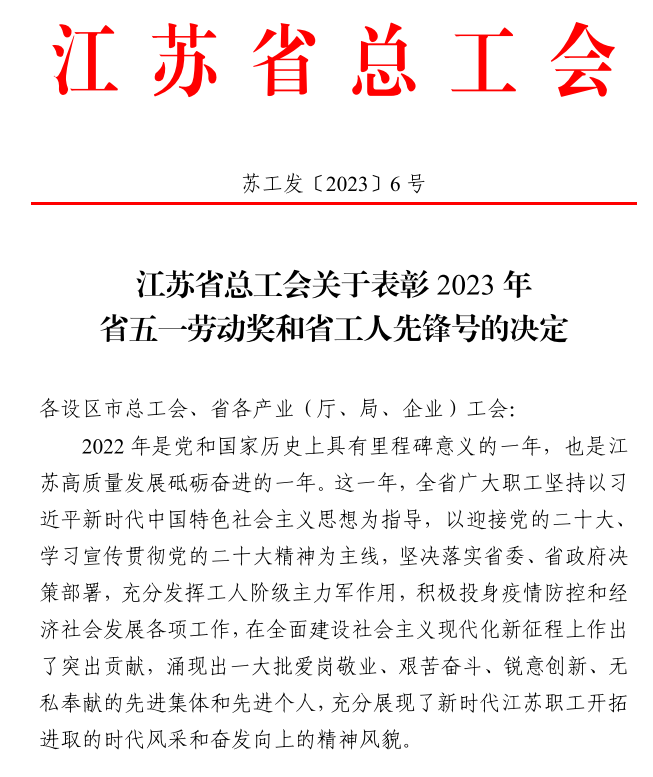4月27日,江苏省总工会下发《关于表彰2023年省五一劳动奖和省工人先锋号的决定》(苏工发﹝2023﹞6号)文件,对过去一年爱岗敬业、艰苦奋斗、锐意创新、无私奉献的先进集体和先进个人进行表彰。我校浪live 被评为“江苏省工人先锋号”。