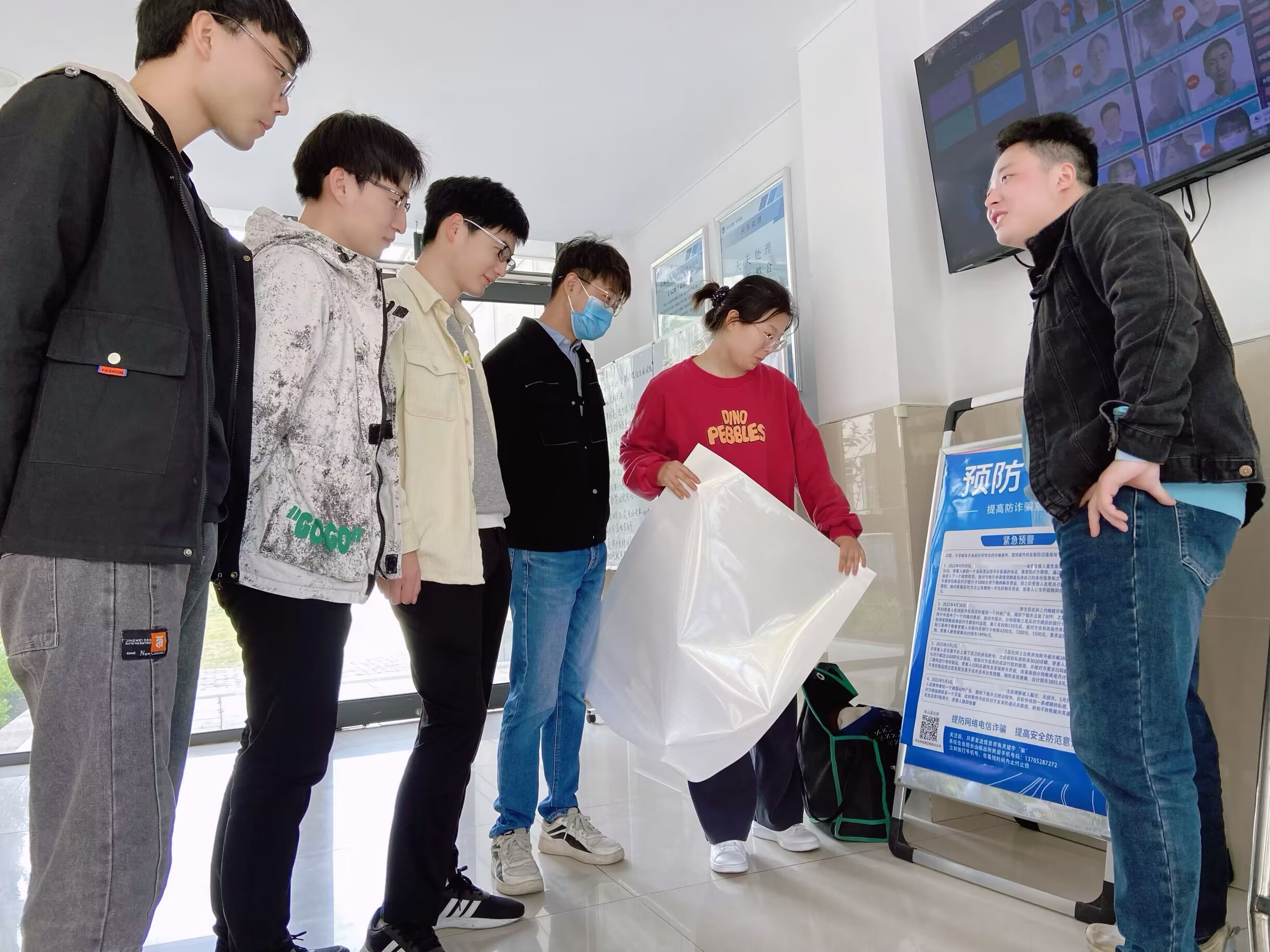 研究生辅导员朱志贤带领学生在学生社区张贴常见电信网络诈骗案例及防范提示的海报,希望通过这种方式,时刻提醒同学们谨防电信网络诈骗,让反诈常识入眼、入心、入脑。同时向同学们分发反诈骗宣传单,以图文并茂的形式,向大家生动讲解诈骗的特点、方式以及如何识别、应对、防止上当受骗的办法,提醒同学们“不轻信,不汇款”,远离诈骗犯罪。