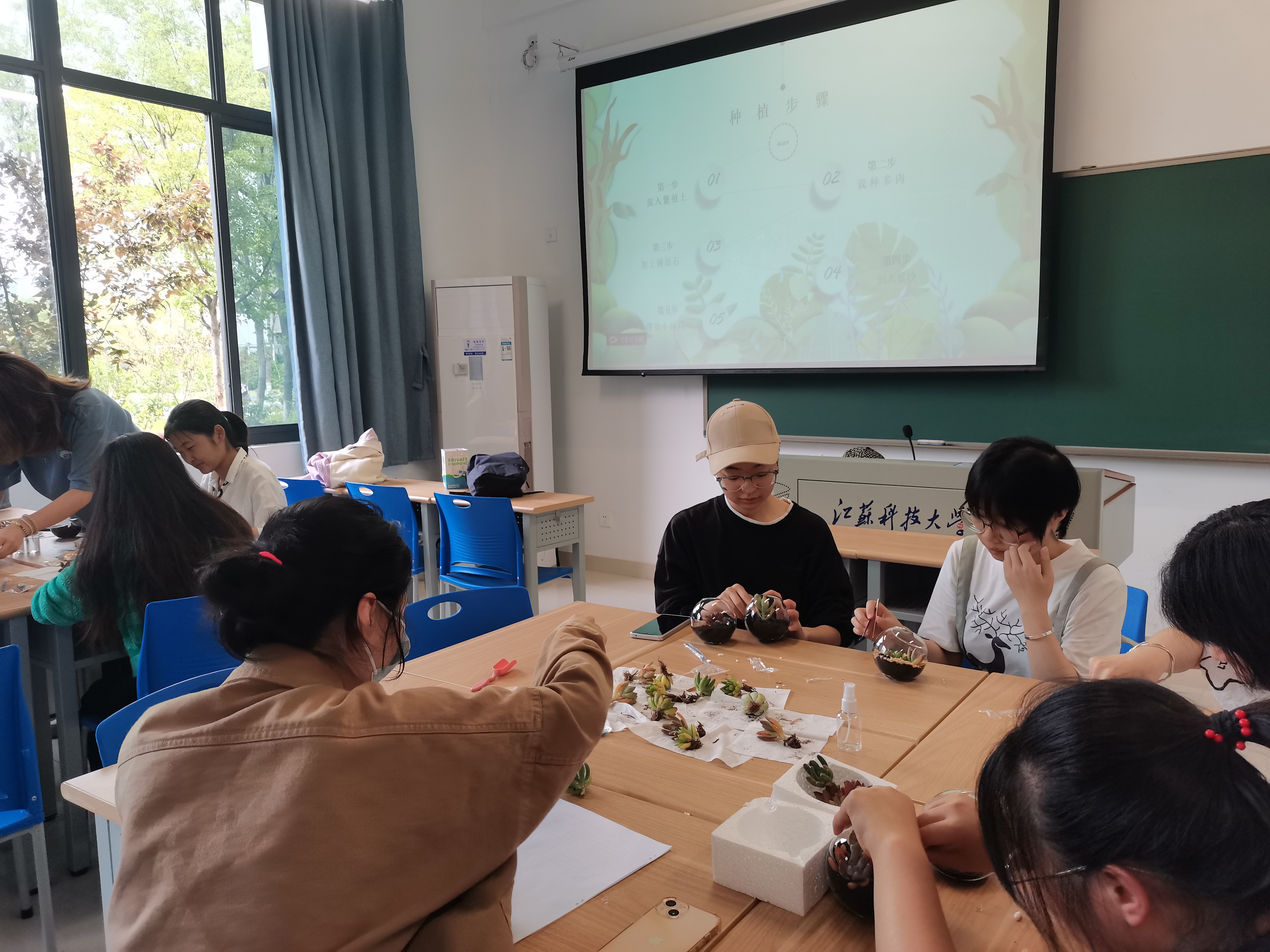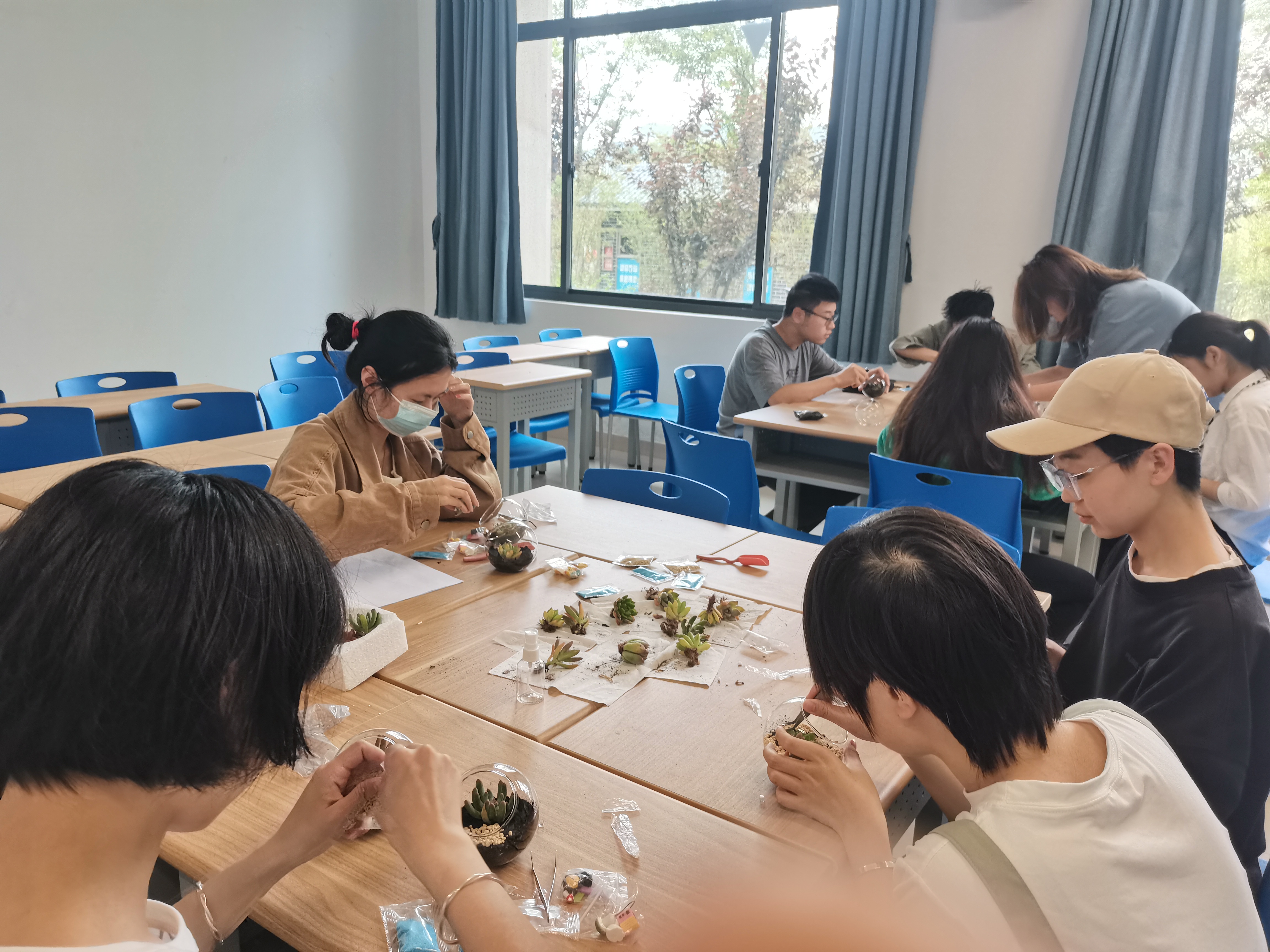 在开始制作微景观之前,谭静老师给同学们介绍了制作微景观的一些注意事项。随后大家分为3个小组,积极构思布局,制作属于自己的“掌心花园”。同学们小心翼翼的把植物分开,在花盆里放入新鲜的营养土,挖出一个小坑,接着把植物埋下,放上彩色的摆件……就这样在指尖灵巧摆弄下,一件件各具心灵特色的微景观新鲜出炉啦。最后,在分享环节,同学们与泥土、绿植一次次亲密接触感受到了生命的美好与感动,小小的微景观给大家带来了更加积极生活方式与态度。