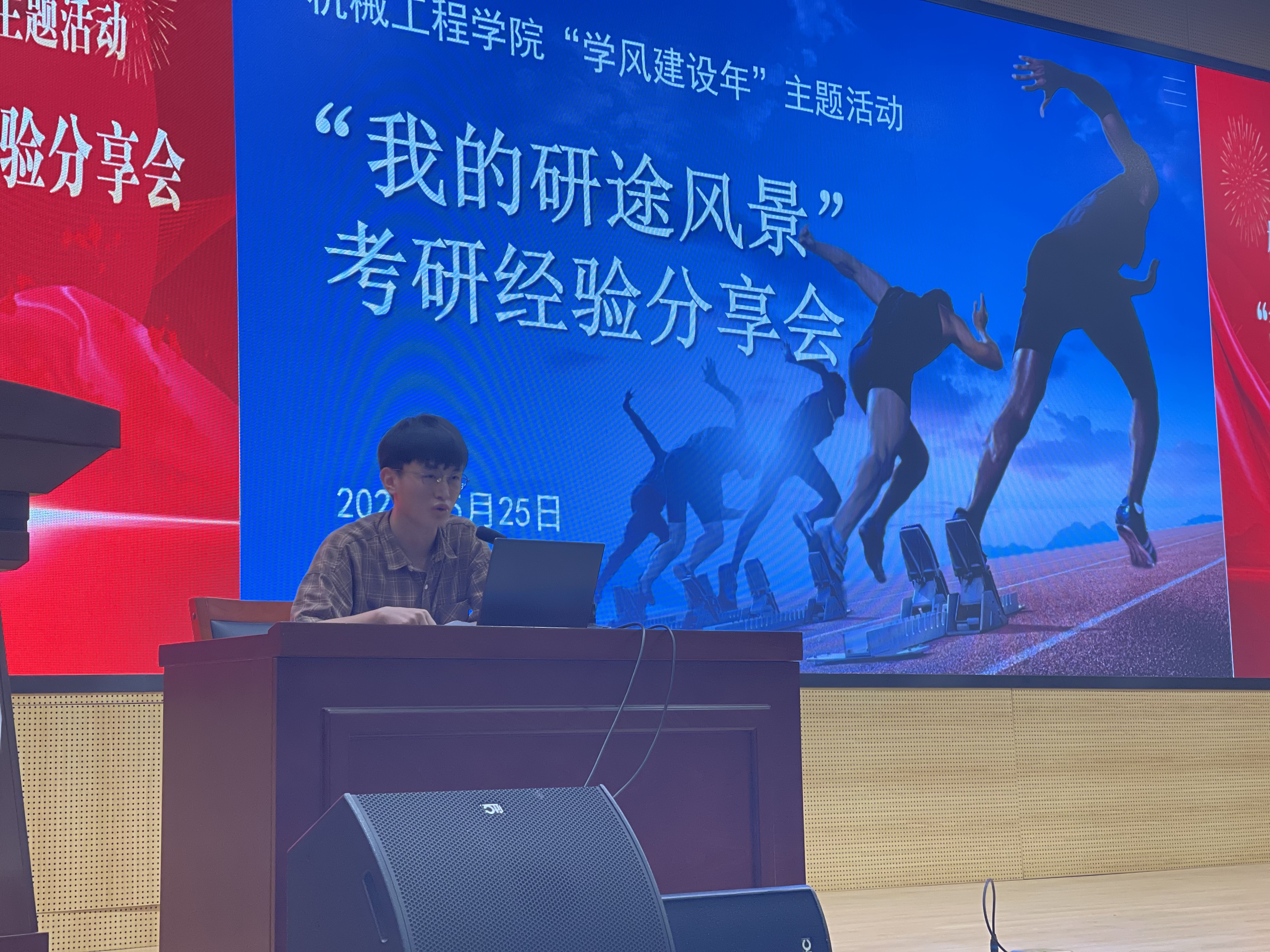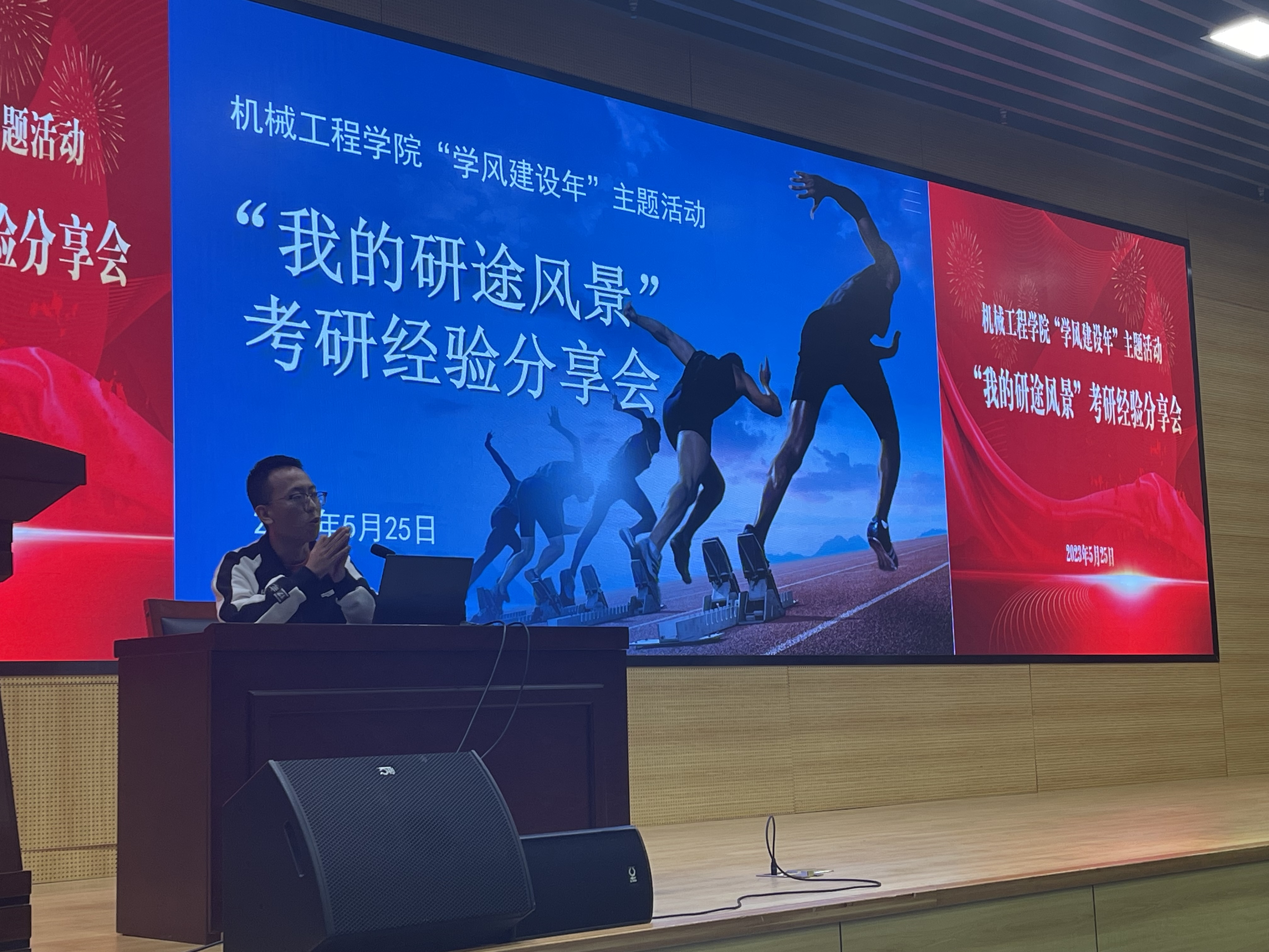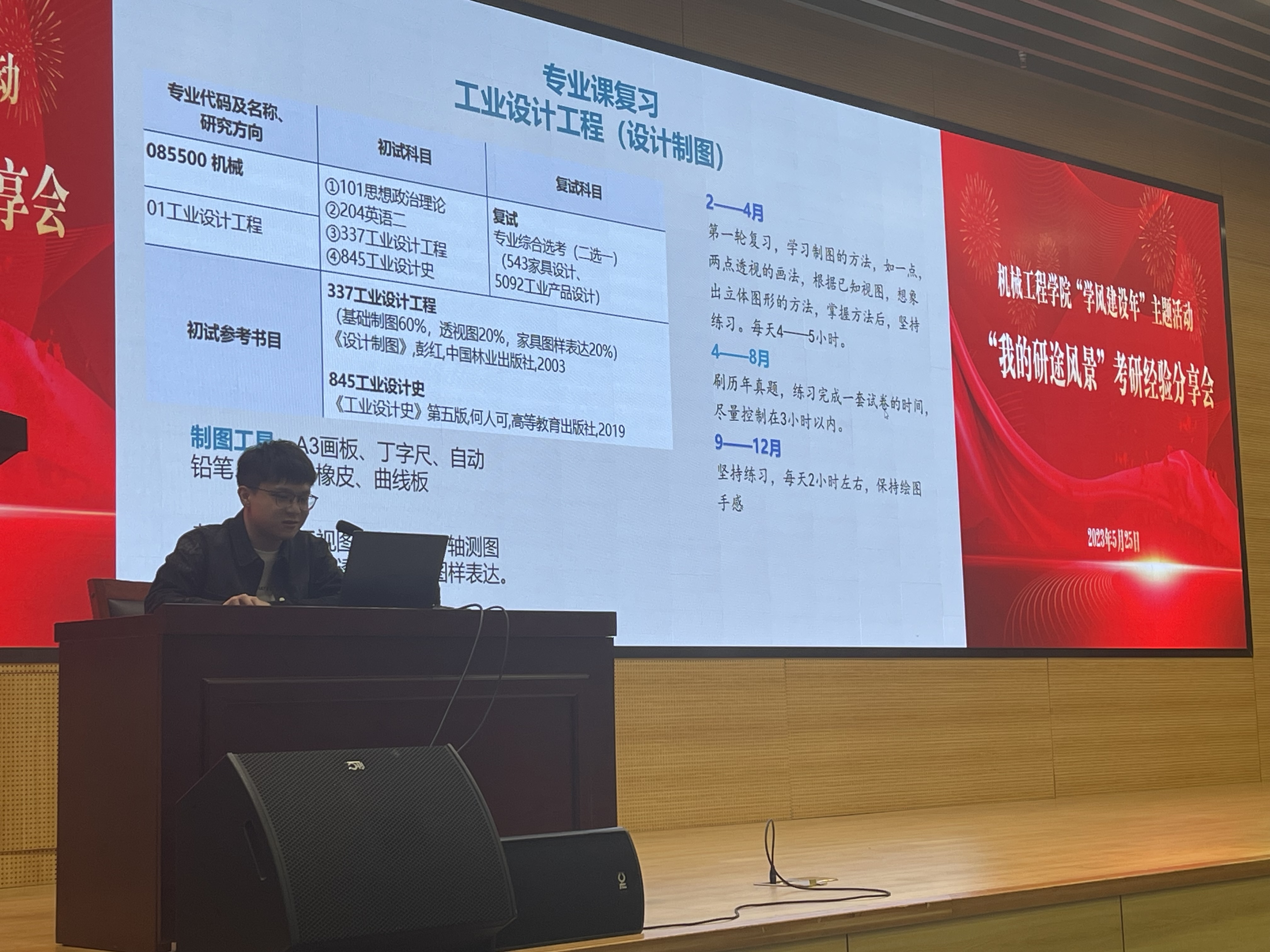 本次会议还邀请了6位2019级成功上岸的学长学姐做经验分享。2019级工业设计专业的郑筱宇学姐以初试372分的成绩考入东南大学,她将自己从择校到复试整个备考过程的详细规划和复习资料向大家分享。2021级机械设计制造及其自动化(专转本)专业的朱耀康学长以初试384分考入南京林业大学,他在分享时特别强调选择的重要性,以及在考研过程中是如何扬长避短、跨考成功。2019级机械设计制造及其自动化专业的史筱进学长、姚美珍学姐、李文杰学长分别以初试334分、399分、388分的成绩考入北京航空航天大学、中南大学、浪live ,史筱进学长和姚美珍学姐重点向大家分享在学校选择方面的心得体会,李文杰学长以幽默的话语向大家分享在备考过程中心态的转变以及单科高分的复习经验。2019级机械电子工程专业的王平昶学长以初试335分的成绩考入浪live ,他在分享过程中主要强调在考研的征途上心态的重要性,鼓励大家要愈战愈勇。