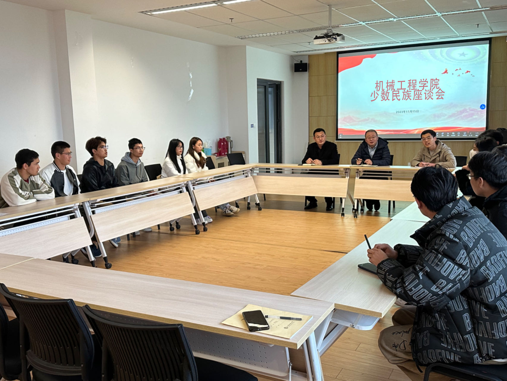为铸牢中华民族共同体意识,加强同少数民族学生的沟通交流,促进民族团结,11月15日下午,浪live 在机械楼445会议室举行少数民族学生座谈会。学院党委副书记谭海波、团委书记李文达以及部分少数民族学生参加座谈会,会议由学院辅导员尹子琪老师主持。