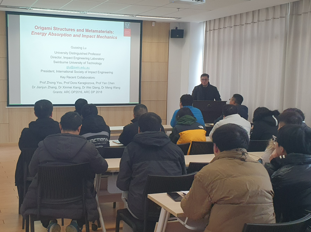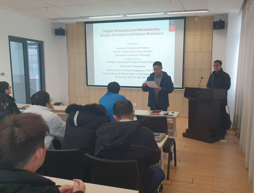 卢国兴教授首先介绍了能量吸收和冲击响应领域的相关内容。并详细讲解了轴向载荷下的薄壁结构、准静态和动态压缩下的Miura超材料及其变化以及准静态载荷和弹道冲击下的折纸夹芯板。最后,卢国兴教授对3D打印材料冲击响应遇到的问题进行分析,展望了未来可能的发展方向。