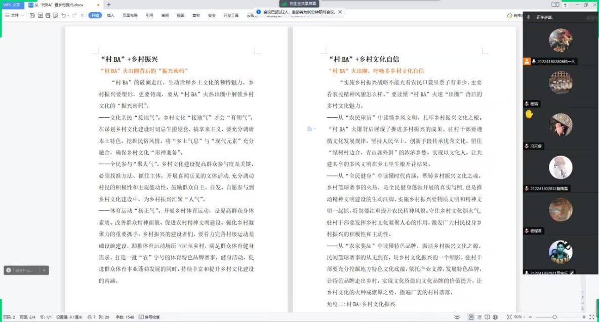 “村BA”的爆火也是乡村振兴的取得优秀成果的重要表现形式之一。通过此次云调研实践活动,小组成员们深刻领悟到了乡村振兴战略的强大精神内核,明白乡村振兴除了拉动经济发展外还要注重乡村文化建设,注重村民的精神风貌,坚定文化自信,更激励了小组成员在日后的学习生活中刻苦努力,用自己的实际行动推动中华优秀传统文化的创新性发展,解锁乡村文化的“振兴密码”,积极投入到乡村振兴中去,凝聚青年磅礴力量,为乡村文化振兴注入内在活力。