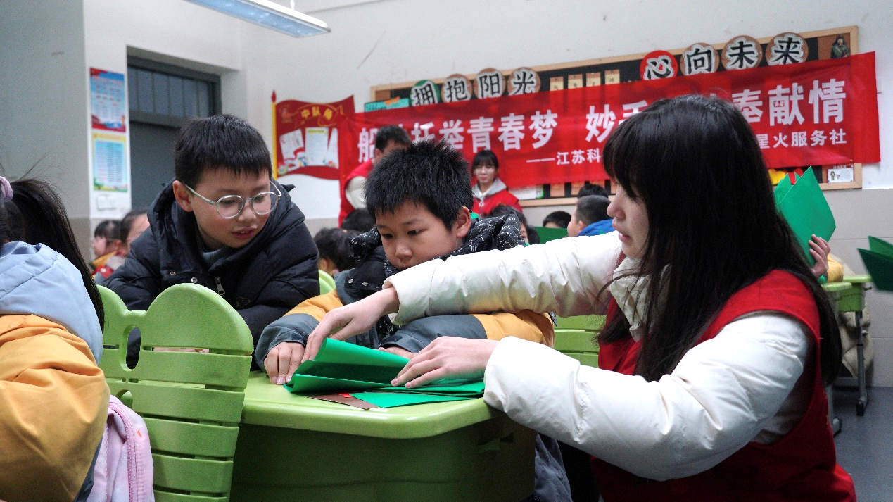 图为志愿者教小朋友们折雷锋帽。 马灿坤 摄