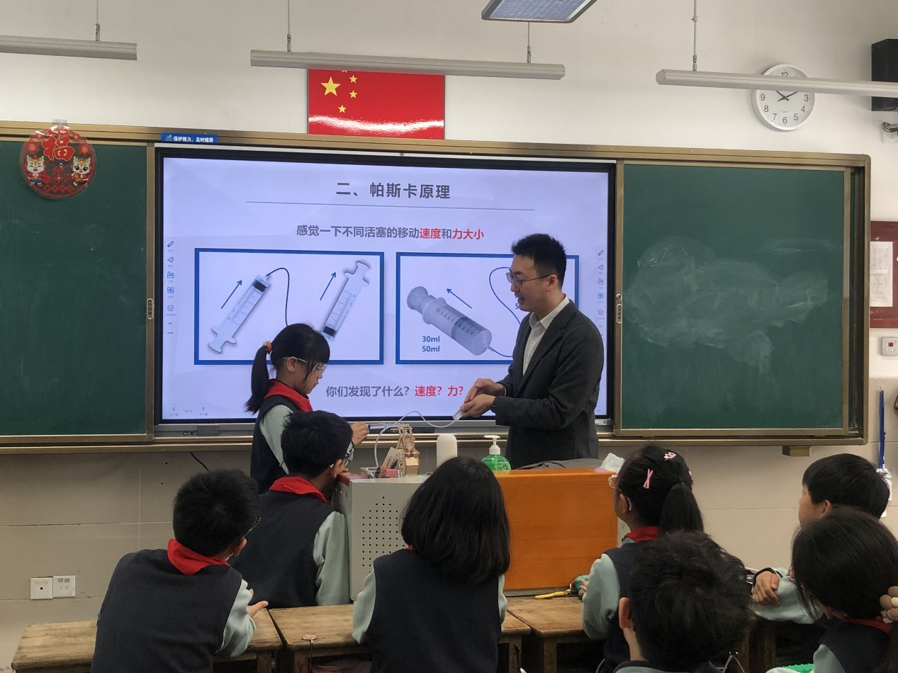 随后,钟教授利用注射器模仿液压千斤顶的工作原理进行对比试验,使学生们更加直观地感受了液压“省力杠杆”的效果,活动现场气氛热烈,学生们踊跃参与实验操作,深刻体验了液压输出力对于不同活塞面积的变化,学生们在轻松愉快的氛围中收获了知识,感受到了科学的魅力。