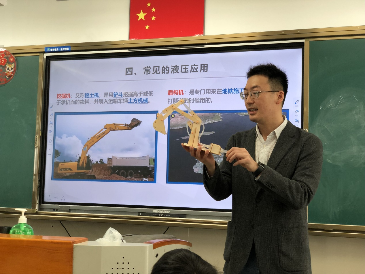 钟教授用浅显易懂的语言,结合生动的实例和模型,向学生们介绍了液压技术的基本原理和应用场景,详细地讲解了液压泵、液压缸和液压阀等核心组件的工作原理。“什么是液压千斤顶?它是如何工作的?”钟教授提问道,他通过问题进一步引导学生们认识了法国物理学家帕斯卡,了解了著名的“裂桶实验”,并且由帕斯卡定律延伸到液压“省力杠杆”。