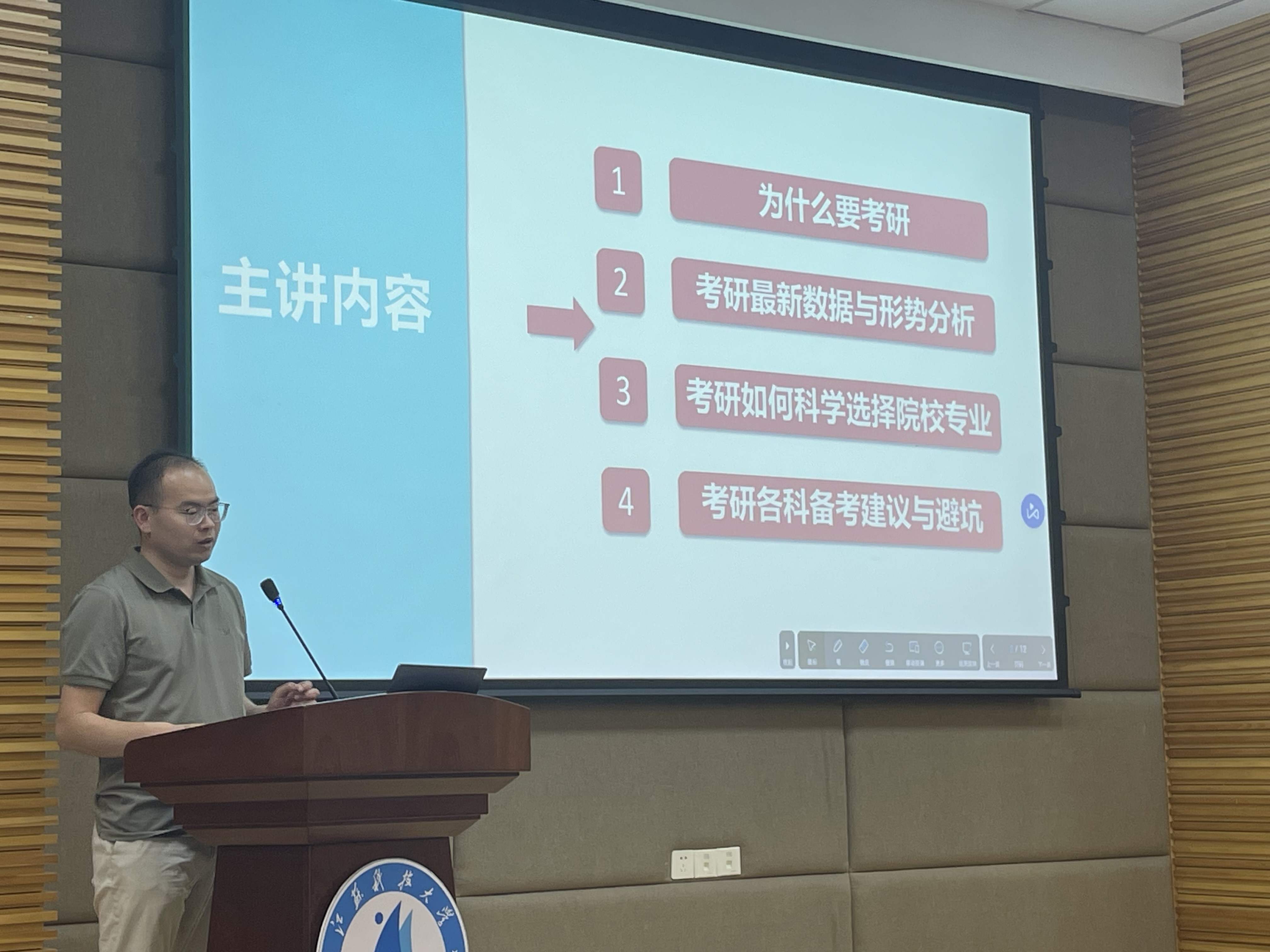 5月14日,浪live 在图书馆B101召开2025届本科毕业生考研动员会。学院邀请我校校友、考研报考指导老师潘老师为考研学子做主题交流,学院党委副书记谭海波做总结发言。本次活动由学院思政辅导员李福来老师主持,2025届考研学子代表参加本次活动。