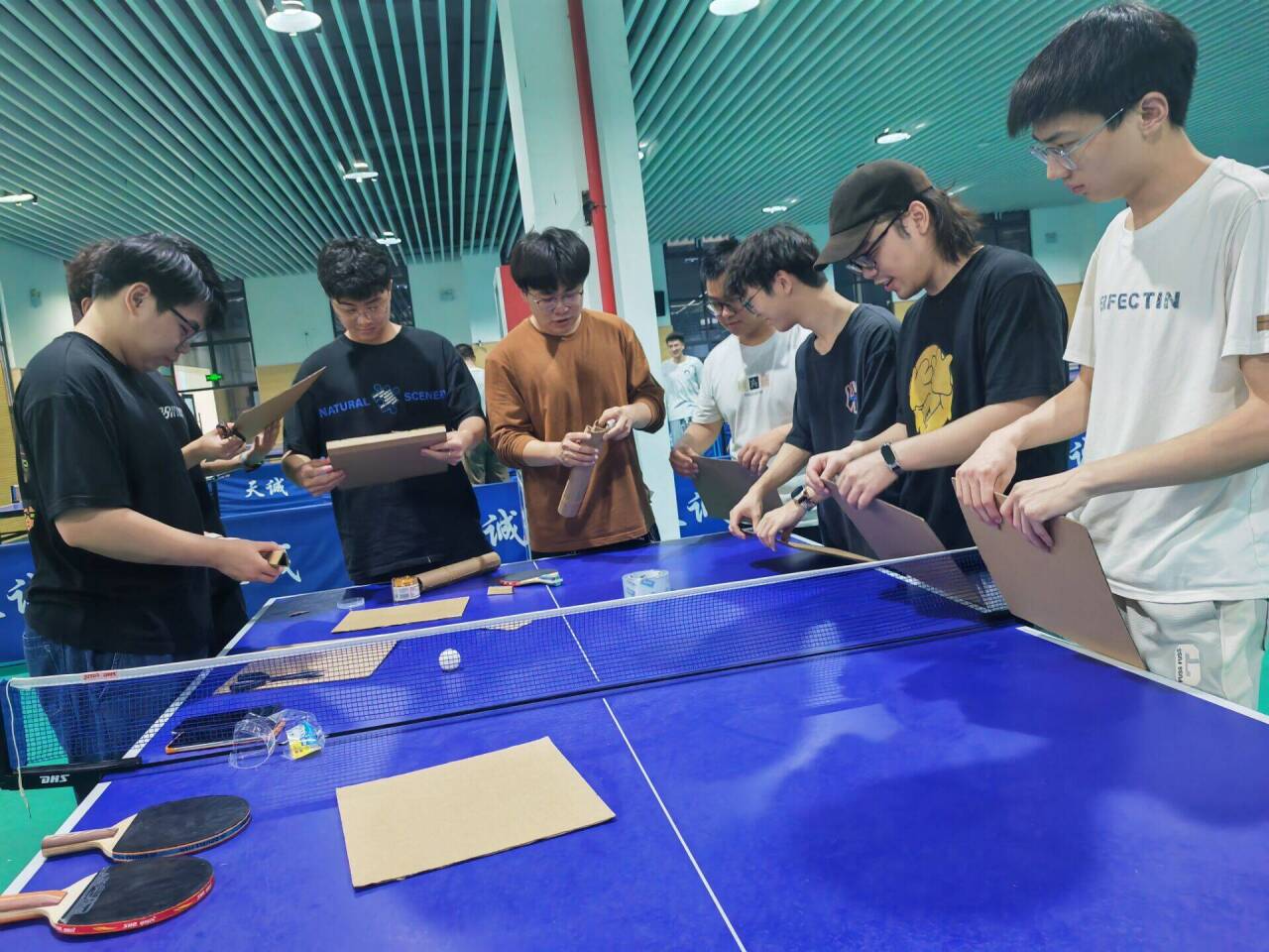 比赛面向浪live 同学,同学们积极报名参加比赛。本次活动1-2人一组,各组根据社联社团部提供的统一材料现场设计好乒乓球弹射模型,在比赛现场通过发射平台进行检验、比拼。由现场的工作人员负责对“羽翼乒乓”乒乓球弹射装置的外观设计打分与发射距离测量,每队有两次发射机会,取最优成绩进行最后的分数统计,按总分进行排名。