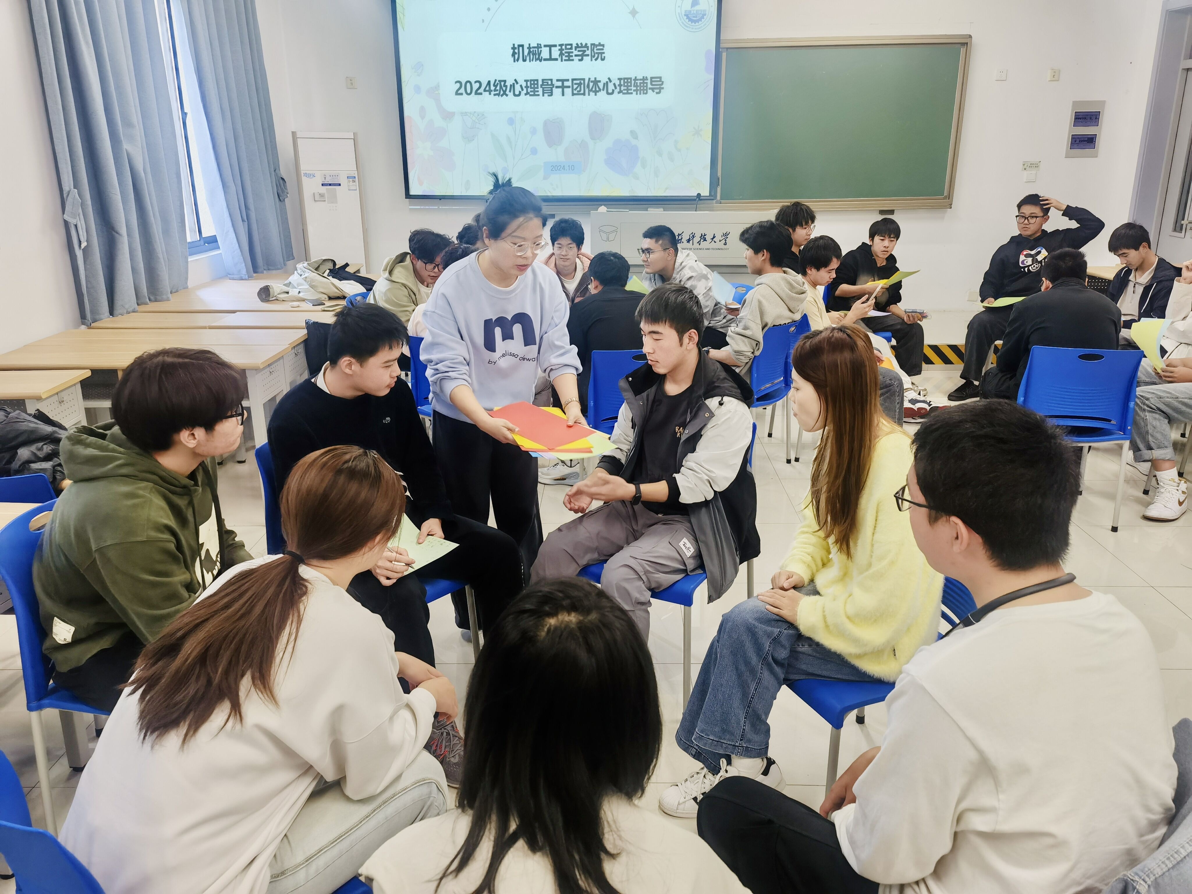 为进一步加强学生心理健康教育指导工作,提升心理骨干队伍的能力水平,同时促进新生相互之间的熟悉,加强学生之间的交流,提升新生对校园环境的适应能力,浪live 于10月29日在经世楼115开展了大学新生环境适应性团体心理辅导,活动由学院心理辅导员朱志贤主持,全体2024级班长、2024级心理委员和部分2023级同学参加。