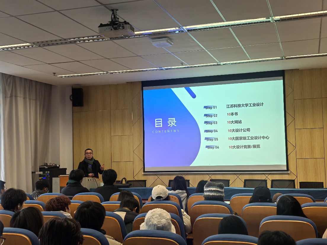 刘李明老师不仅介绍了工业设计专业的学科发展史,还向在座新生推荐了工业设计专业相关的10本书、10大网站、10大设计公司、10大国家级工业设计中心及10大设计竞赛/展览。他还引导同学们利用寒假时间学习一些专业必备技能:PS、手绘、CAD等。
