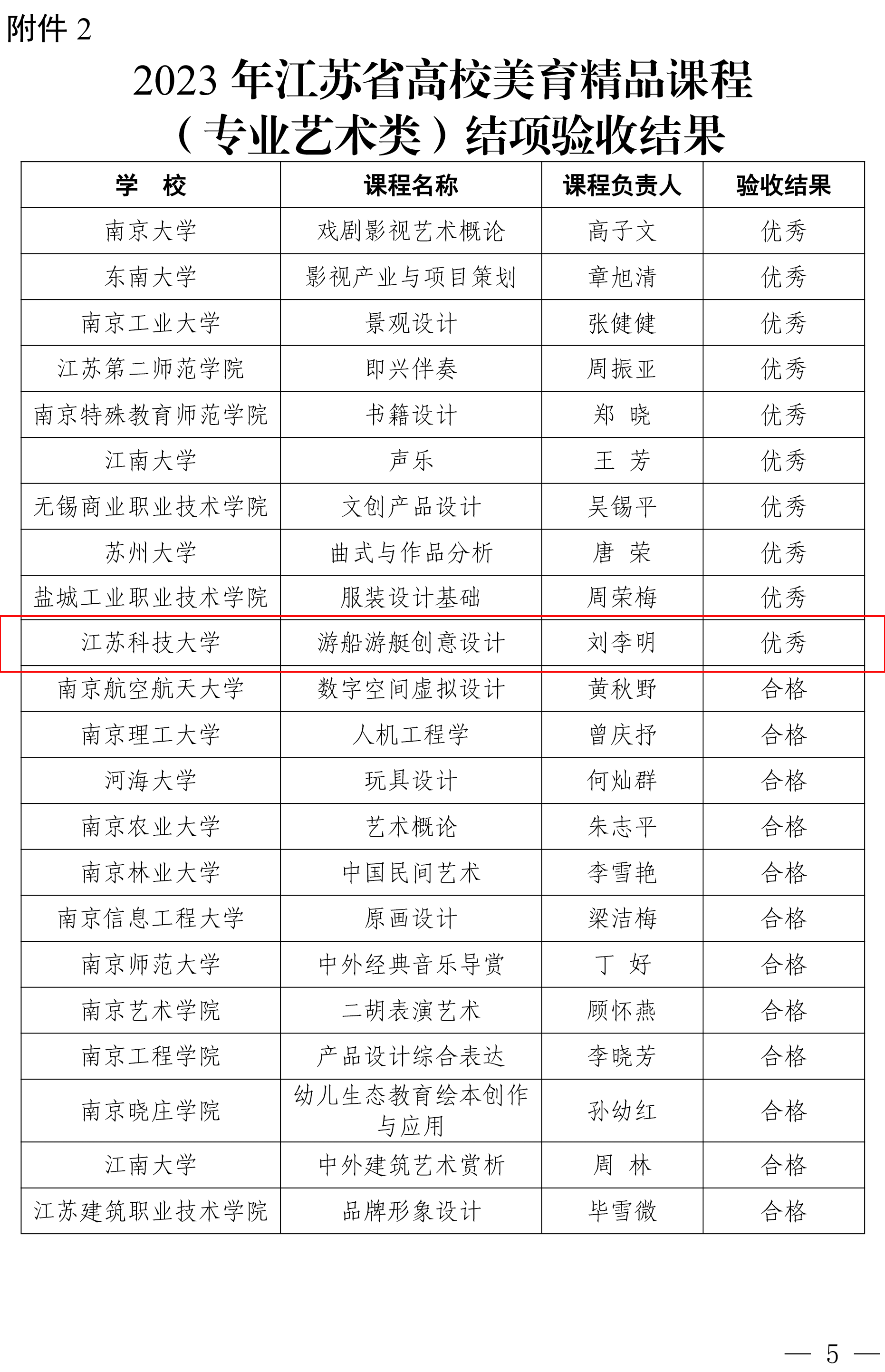 近日,省教育厅对2023 年省高校美育精品课程(专业艺术类)建设进行了结题验收,学院刘李明副教授负责的《游船游艇创意设计》课程结题验收获“优秀”等次,全省共30项通过结题验收,其中优秀项目10项。
