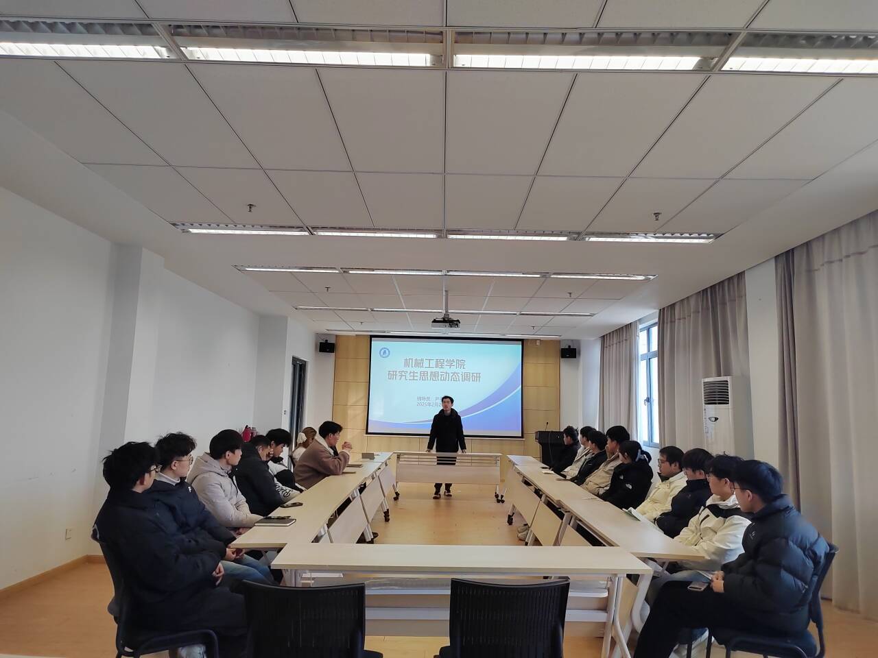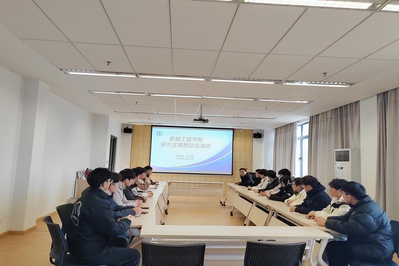 会议伊始,尹老师介绍了此次座谈会的调研重点,包括研究生学业进展、科研压力疏导、职业规划需求及校园生活服务等方面。与会学生代表依次发言,分享了自己在学习和生活中的所思所感,讨论的话题涵盖了学业压力、宿舍管理、后勤服务等多个方面,展现了大学生的思想状态和对生活的敏锐洞察。尹老师认真记录并逐项回应学生关切,充分肯定了机械学子"严谨务实、创新进取"的精神风貌,鼓励大家保持朝气蓬勃的精神状态,在学习上和生活中发挥好模范带头作用。