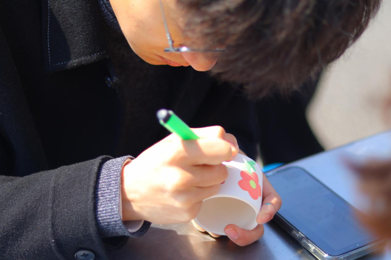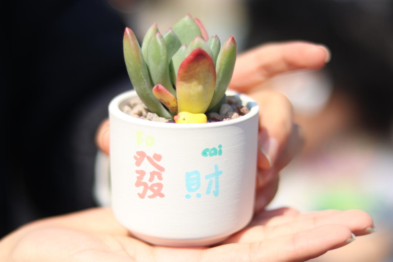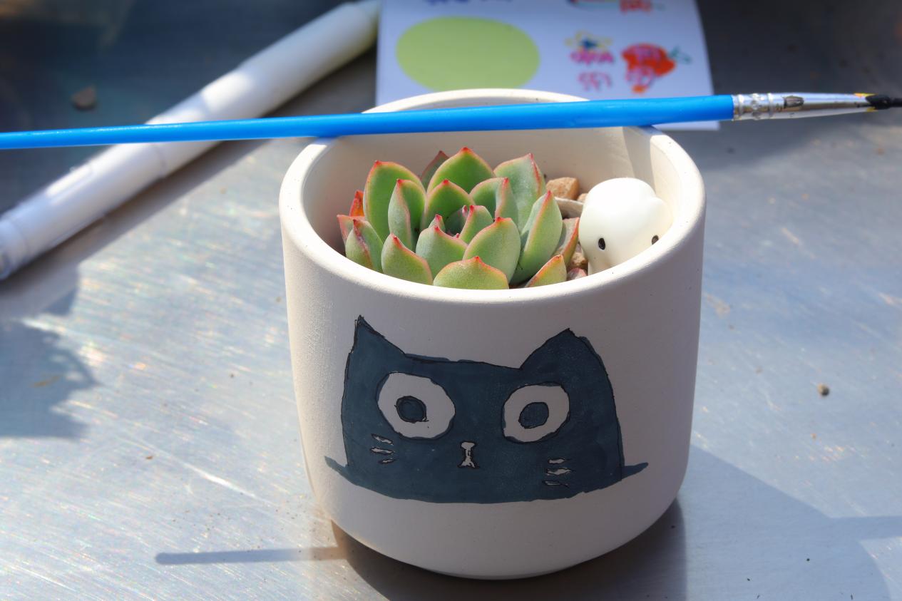 同学们迫不及待地投入到创作中,充分发挥奇思妙想。有的同学用细腻的笔触在花盆上绘出校园标志性建筑,让校园风景与多肉相映成趣;有的则用明亮活泼的色彩,画上可爱的卡通形象,为花盆增添俏皮可爱的氛围;还有同学在花盆上写下了对自己的祝愿,使其成为独一无二的春日摆件。