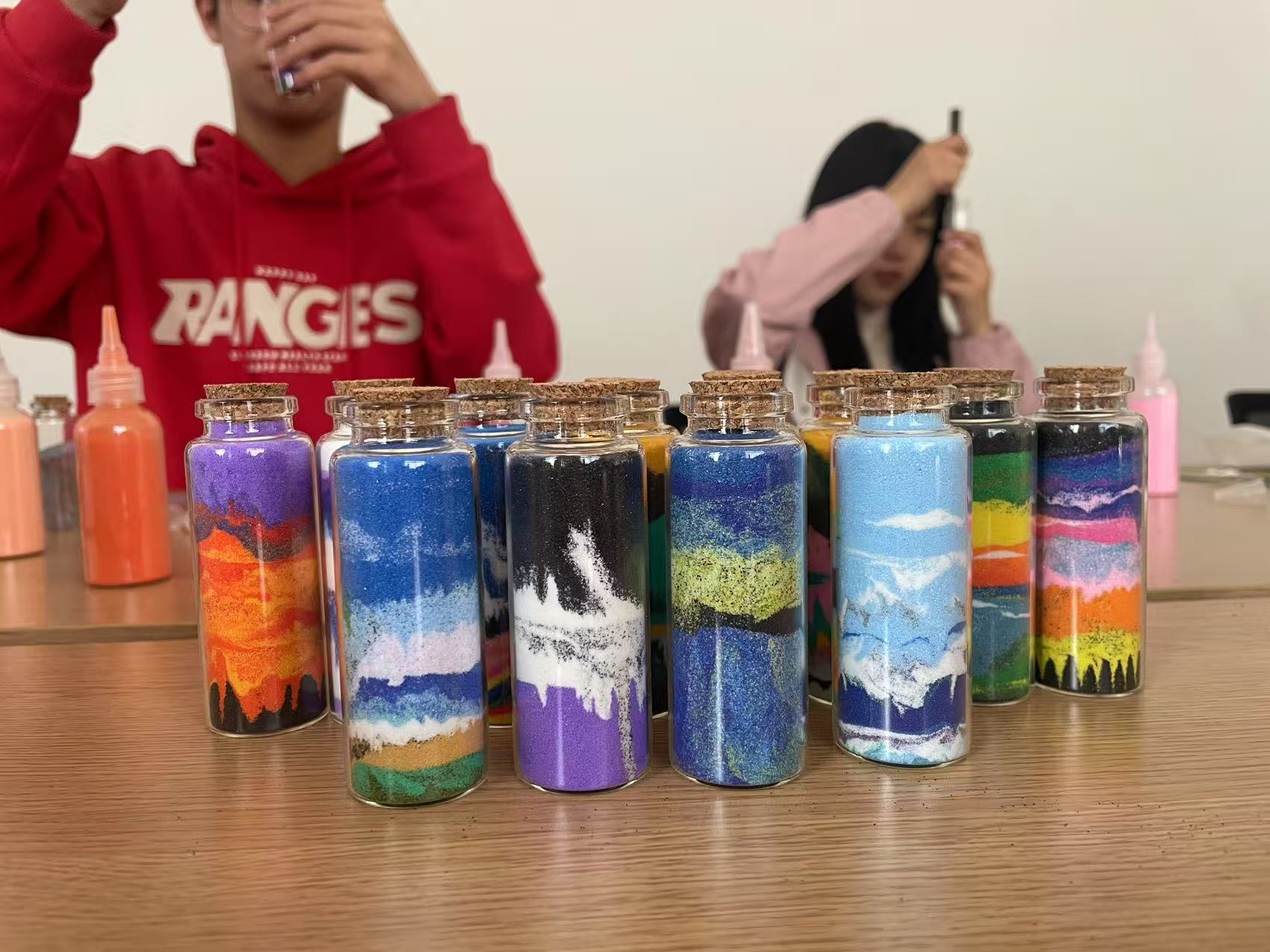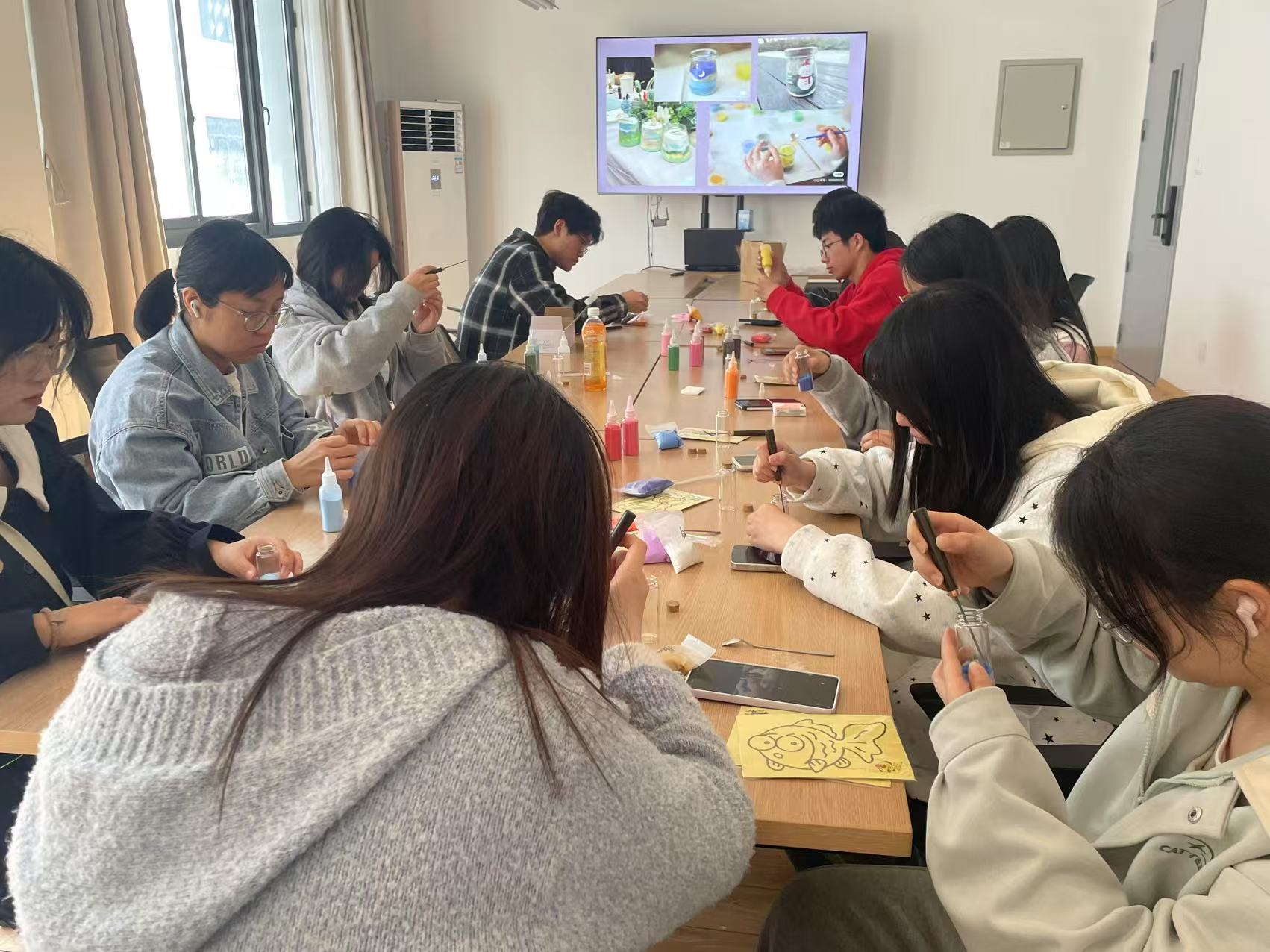 活动现场,同学们通过"选色-构思-绘制"将五彩细砂分层注入透明玻璃瓶内。以沉浸式创作的方式将近期的学习压力、情感困惑转化为具象化的艺术表达。机制专业的王同学分享创作感悟:"当指尖流动的彩砂在瓶中定格成情绪画卷时,那些困扰我的焦虑突然变得具象可感,完成作品后心情豁然开朗,仿佛完成了一次心灵SPA。"