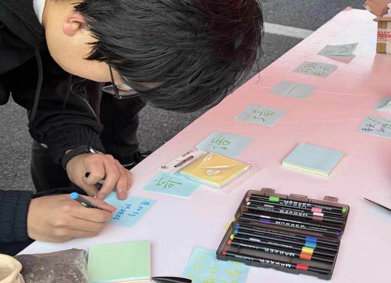 正式活动开始,学生们在铺满花瓣的长桌前俯身书写,笔尖摩挲特制宣纸明信片时发出细碎沙响,在便签纸上写下自己对春天的期许、本学期目标、未来规划等寄语。有人将写好的寄语系上嫩绿丝带,踮脚挂至梧桐枝造型的铁艺架上,垂落的流苏坠子与隔壁同学的字条轻碰,叮铃作响。工作人员推着载满多肉植物的木轮车穿梭其间,青瓷盆底手写的"向阳而生"在春光里若隐若现。
