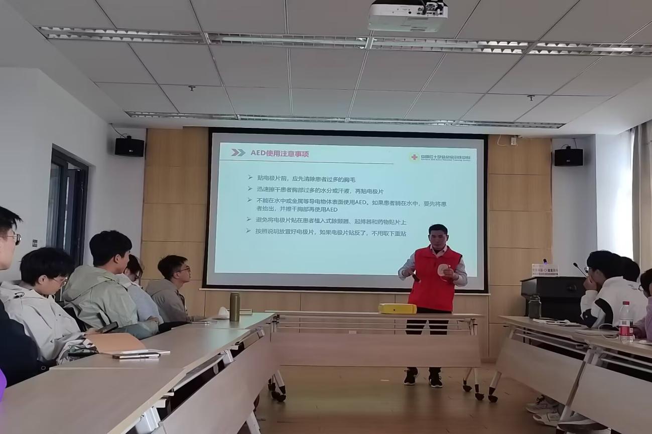 培训课程涵盖理论讲解与实操演练两大模块。理论课程由镇江市红十字会应急救护师资、浪live 校医院副院长徐勋淦主讲,重点介绍了常见急救方法和创伤救护理论。为更好开展实操训练,参训学生分设3个小组同步开展心肺复苏操作练习、AED机及使用方法练习和基础创伤救护操作练习。同学们热情高涨,每位学员均通过模拟操作考核,确保技能掌握达标。