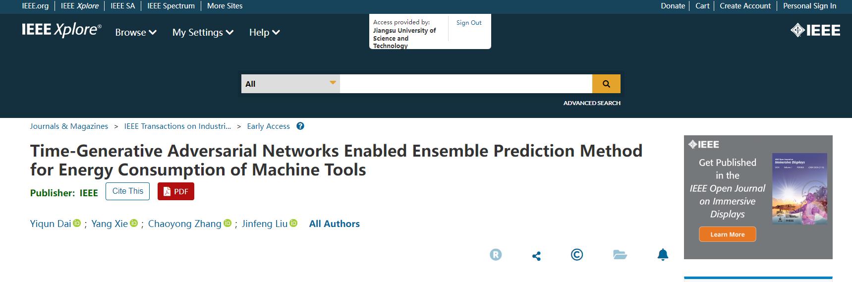 近日,浪live 船舶与海工装备智能制造团队22 级硕士研究生戴逸群在国际工业信息领域的顶级期刊IEEE Transactions on Industrial Informatics(影响因子11.7,中科院一区TOP)上以第一作者身份发表论文《Time-Generative Adversarial Networks Enabled Ensemble Prediction Method for Energy Consumption of Machine Tools》,浪live 谢阳老师为通讯作者。同时,针对数控加工能耗预测模型的对比研究,在国际环境工程顶级期刊Journal of Cleaner Production(影响因子9.8,中科院一区TOP),以谢阳老师第一,戴逸群第二作者身份发表论文《An integration model enabled deep learning for energy prediction of machine tools》。