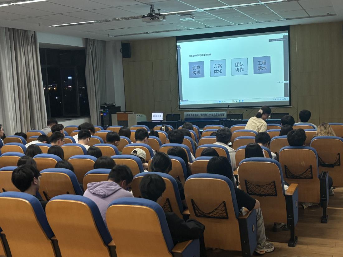 紧随其后,校友倪子恒,12级工业设计毕业学生,现任零跑科技股份有限公司设计师,曾参与零跑B10汽车设计,他围绕“汽车设计师的日常工作内容、汽车设计入行接口与方式、技术变更下的汽车设计方式演变”三大块内容展开深度分享。他结合行业案例与自身实践,系统剖析汽车设计领域的发展趋势,用自身将兴趣转化为职业的成长轨迹,为同学们展现了工业设计专业广阔的发展前景。在交互环节,面对同学们的热切追问,倪同学毫无保留地分享了封闭式培训快速入行的实用技巧、汽车设计完整周期流程,以及本科生就业形势、考研方向选择等“硬核”知识。
