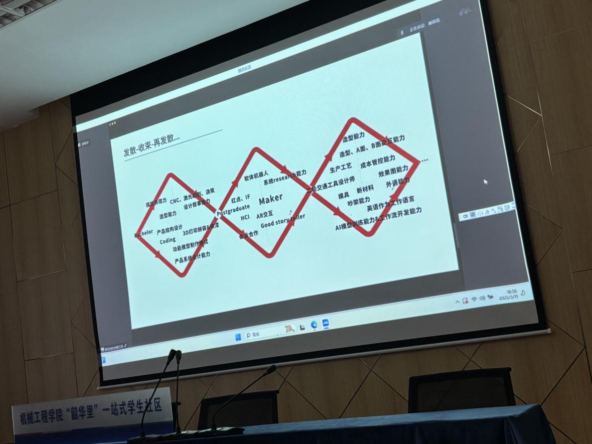 分享会上,校友谢琪琪,16级工业设计毕业学生,现任雅迪集团工业设计师,他以“发散-收束-再发散”为主题,分享了从本科求学、硕士留学深造到成长为二轮交通工具设计师的蜕变之路。他结合自身经历系统梳理了不同阶段的核心能力培养:本科阶段着重夯实造型能力;硕士留学期间,聚焦AR交互技术的钻研与实践;步入职场后,他笑称“吵架”也是必备技能,强调在多方协作中学会清晰表达观点、据理力争,同时突出英文能力在国际项目沟通中的重要性。谢同学的娓娓道来中展现了一个人从求学历程中的迷茫与坚定到职场打拼的挑战与突破,引发了现场同学的强烈共鸣与深刻反思。虽隔着屏幕,但阻挡不了现场同学们与学长交流的热情,同学们纷纷围绕在校能力培养、留学申请策略、求职面试技巧、职场工作心得、学科竞赛准备,甚至校园生活规划等多个维度踊跃提问。谢同学逐一耐心解答,为学弟学妹们拨开成长迷雾,照亮前行方向。