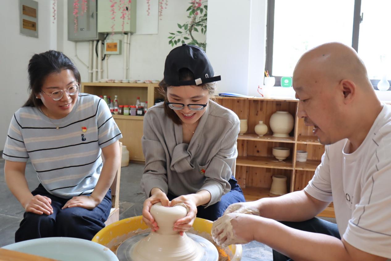 随后,师生们来到大师工作室,亲身体验陶瓷制作的乐趣。在陶瓷大师的耐心指导下,大家纷纷动手,尝试拉坯、塑形、绘画等工艺。通过这种‘做中学’的方式,不仅让思政教育更加鲜活,更是让师生们体会到工匠精神不仅需要理论领悟,更要通过实践内化于心。
