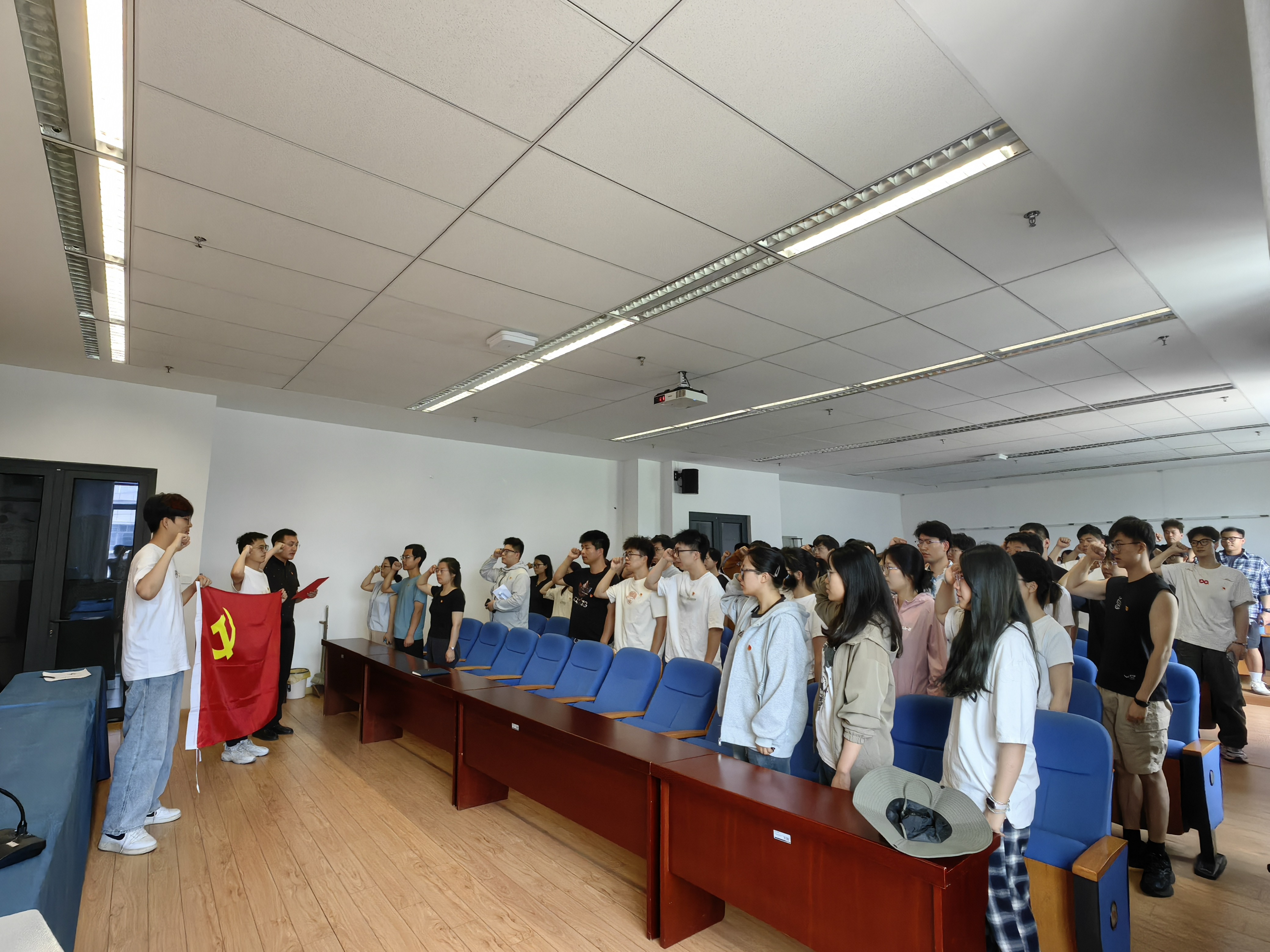 活动在庄严雄壮的中华人民共和国国歌声中拉开帷幕,全体毕业生党员面向党旗,高举右拳,在工业设计学生党支部书记李文达的带领下,重温入党誓词。“我志愿加入中国共产党……”铿锵有力的誓言响彻会场,这是对党组织的庄严承诺,更是毕业生党员们矢志为共产主义事业奋斗终身的郑重宣言。
