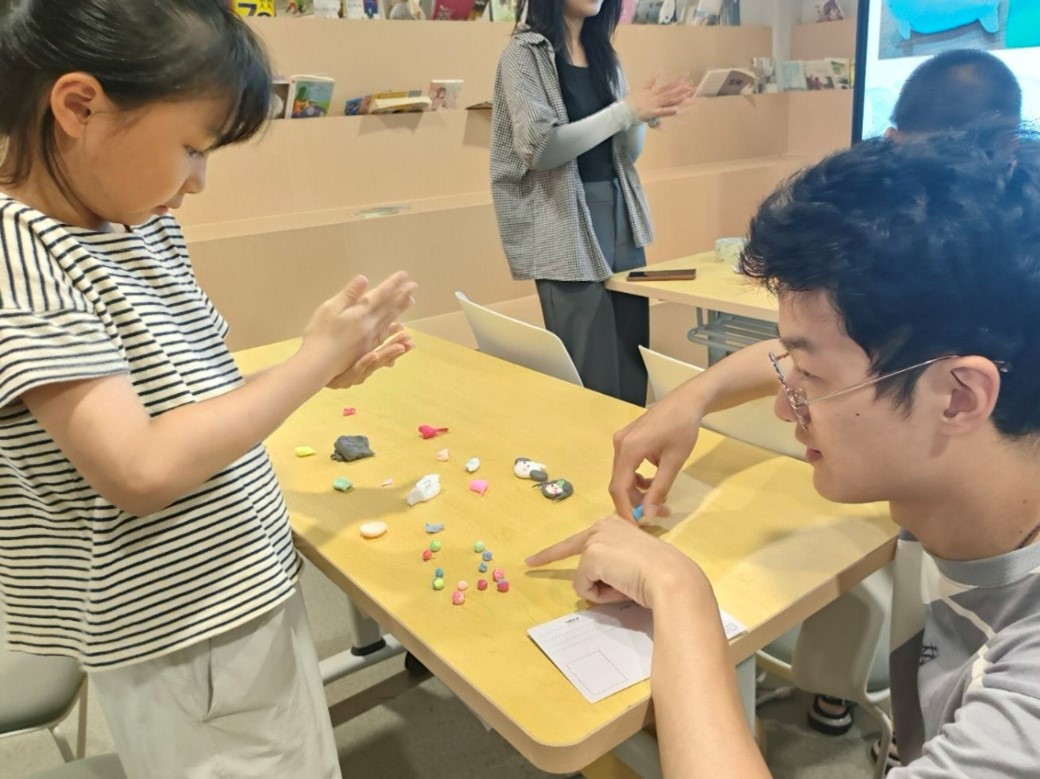 图为陈雨彤同学和小朋友们用粘土捏江豚