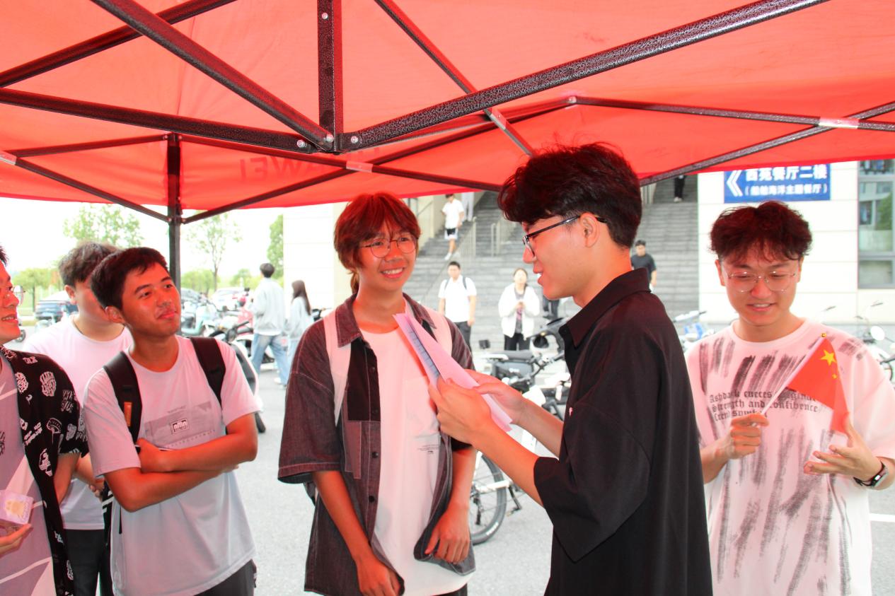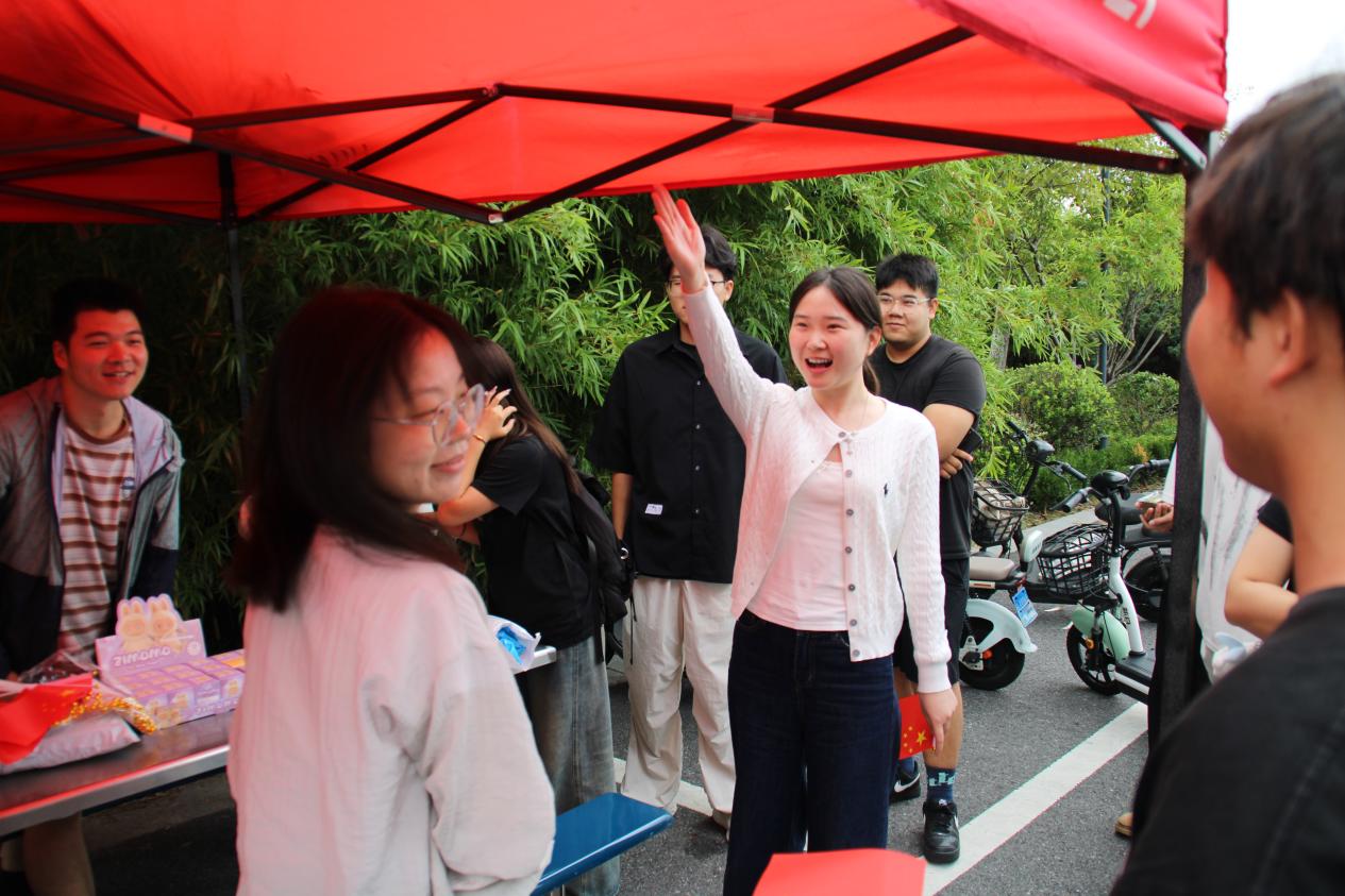 “欢庆国庆,知识竞猜”环节趣味与知识兼具。工作人员准备了涵盖中国历史文化、政治经济及国庆知识的选择、判断题卡。“中国抗日胜利是哪一年”“公有制是社会主义经济制度吗”等题目引发同学们的积极作答。答对者不仅获得了桌面摆件与盲盒,还在答题中深化了对祖国历史成就与时代发展的认知。