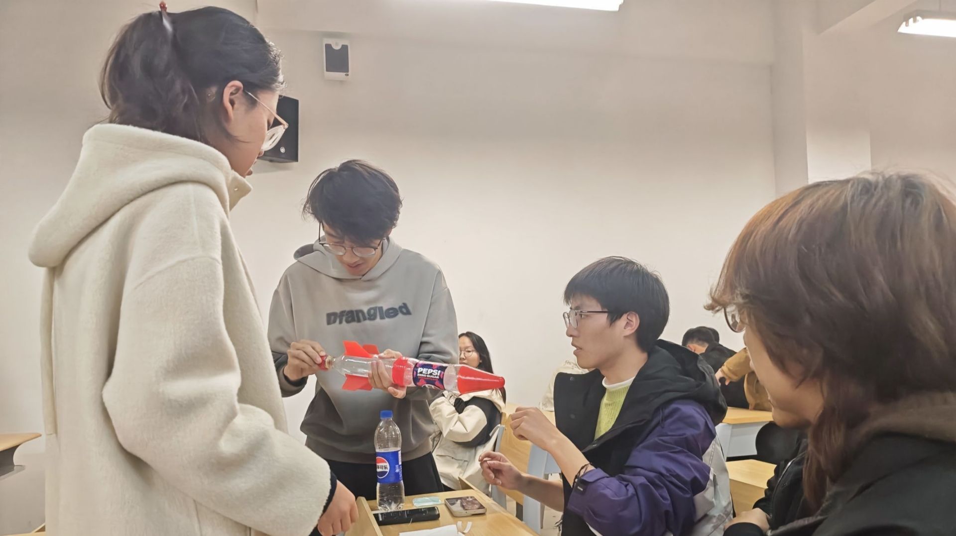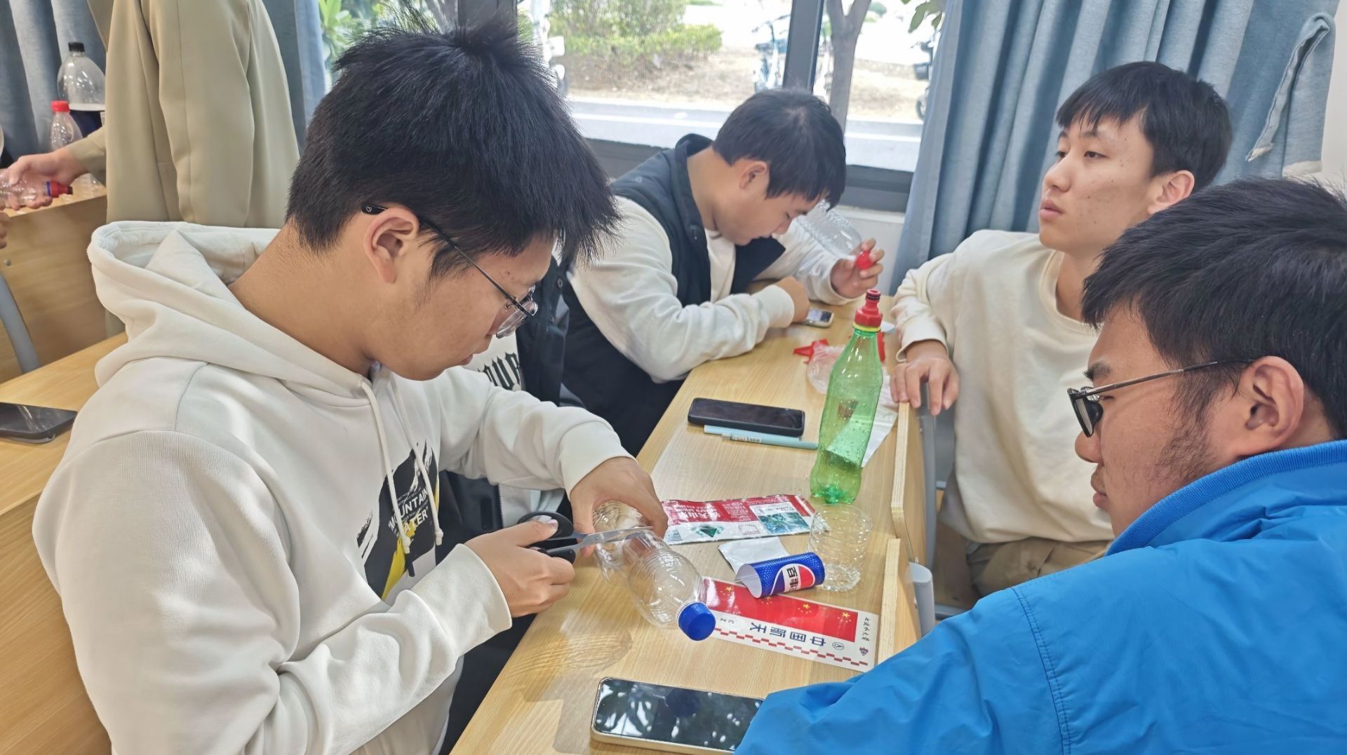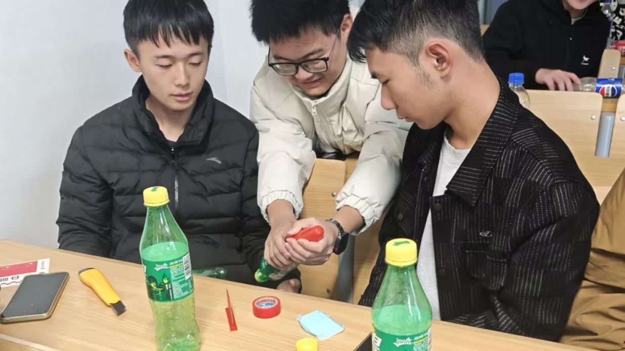 制作过程中,同学们几人一队,围绕水火箭的气动外形优化展开热烈讨论。“尾翼角度可以再微调一下”“瓶身结构需要进一步加固”等建议声此起彼伏。面对制作难题,大家互帮互助、集思广益,展现出良好的团队协作与问题解决能力。