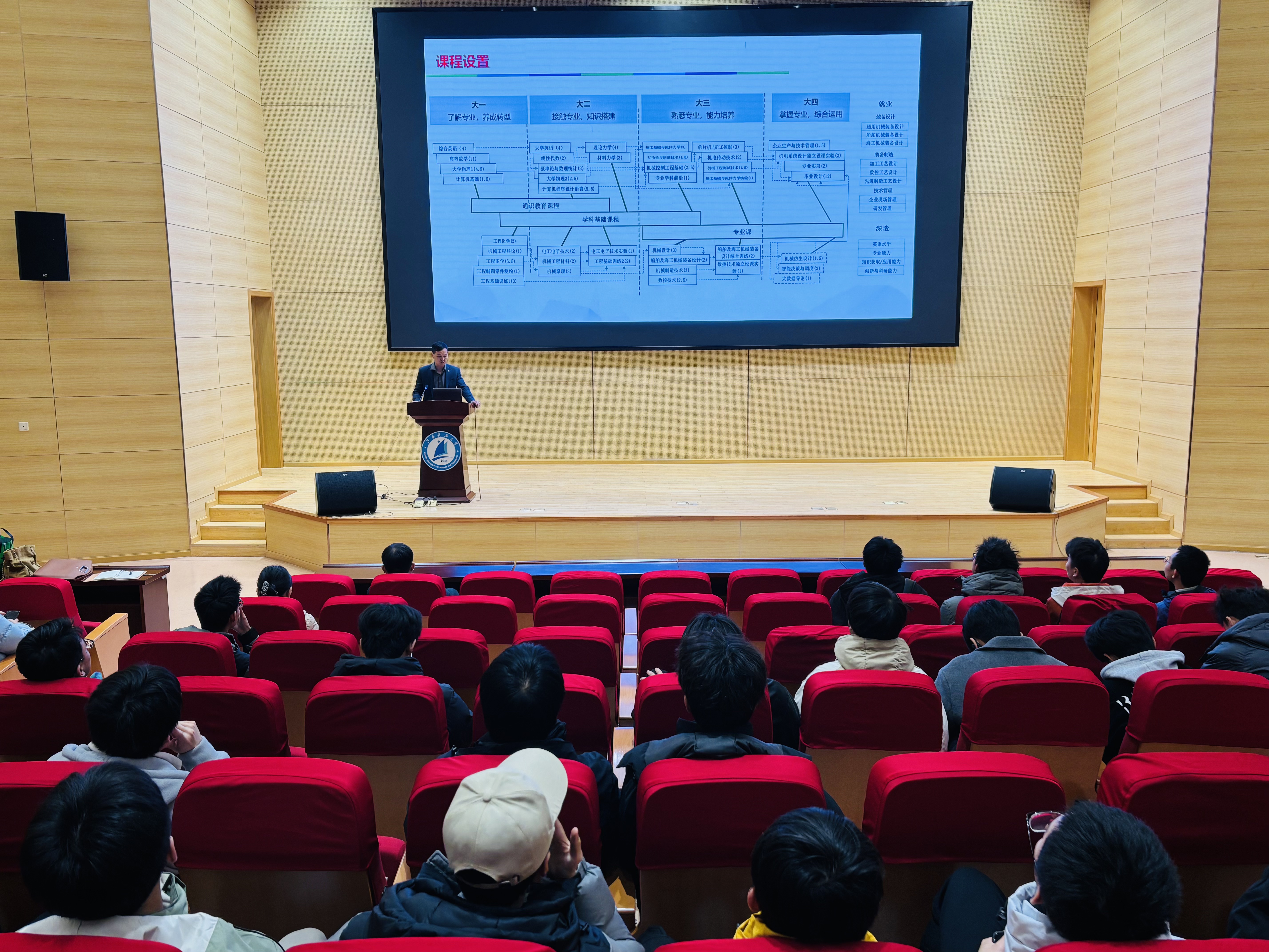 活动伊始,机械设计制造及其自动化专业负责人何强老师率先登台,为新生们带来专业认知的“第一课”。他围绕专业概况、科研研究方向、师资力量、竞赛获奖、专业学习及能力提升、毕业生就业与升学前景六大核心板块展开系统讲解,尤其针对专业课程图谱的逻辑架构与细分研究方向进行了细致拆解。丰富详实的内容、清晰易懂的阐释,不仅让新生对本专业的发展脉络与学习路径有了全面认知,更牢牢抓住了在场同学的注意力,激发了大家对专业学习的浓厚兴趣。