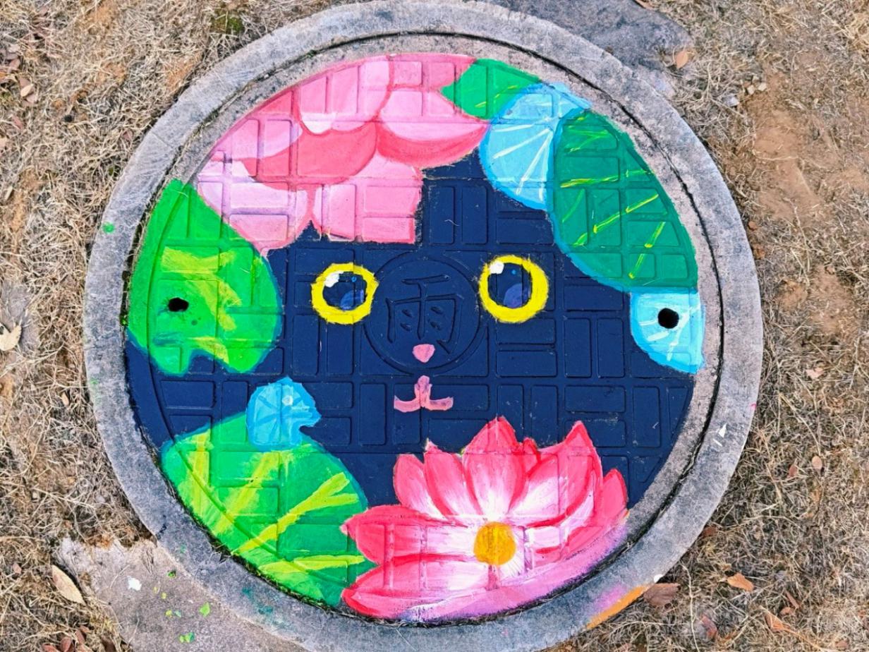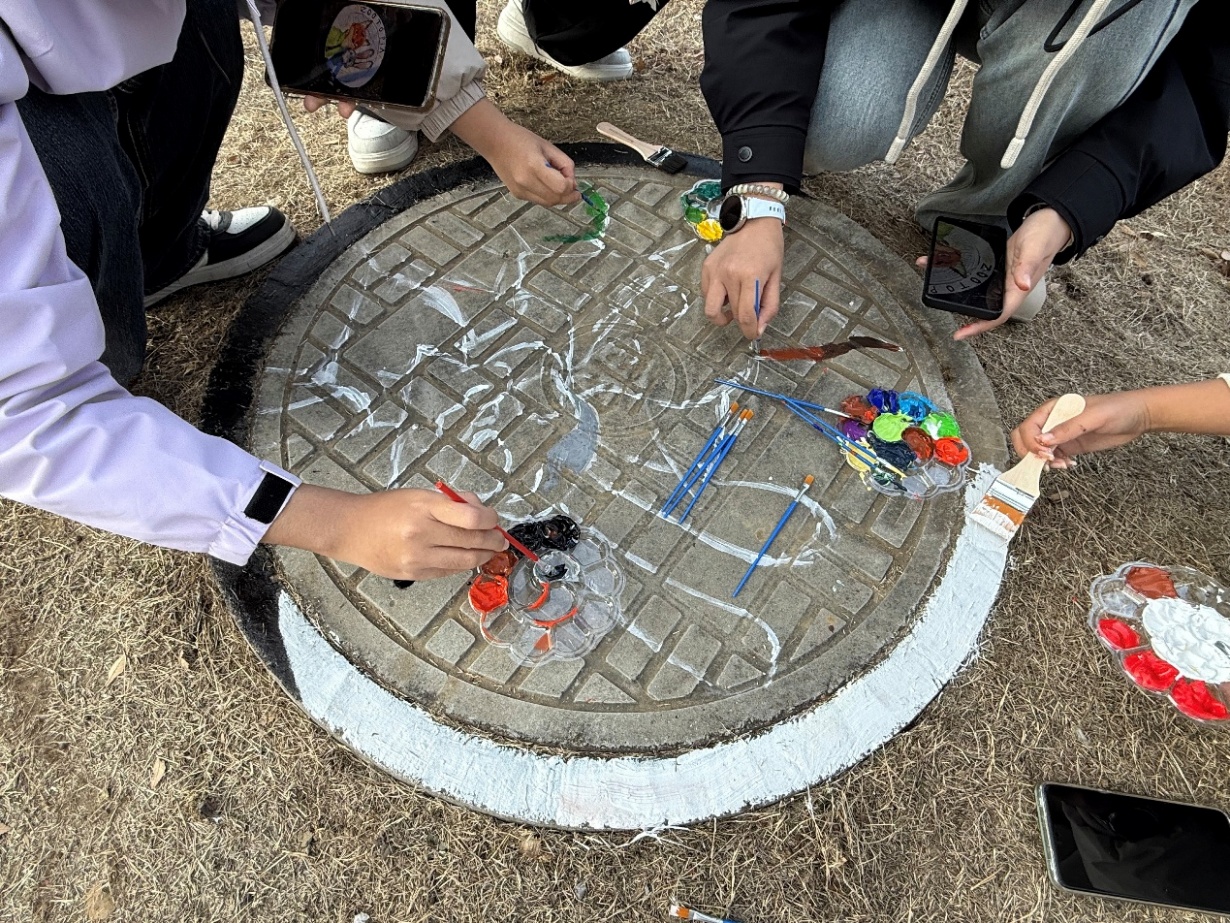 随着颜料铺开,同学们全情投入创作。有人绘制出萌萌的卡通形象,为校园增添一抹治愈,还有人发挥天马行空的想象,创作出抽象图案或励志标语。大家专注的神情与井盖上逐渐浮现的鲜活画面,构成了一道动人的风景线。一笔一画间,灰暗的井盖逐渐“活”了起来,成为承载学子巧思的独特画布。