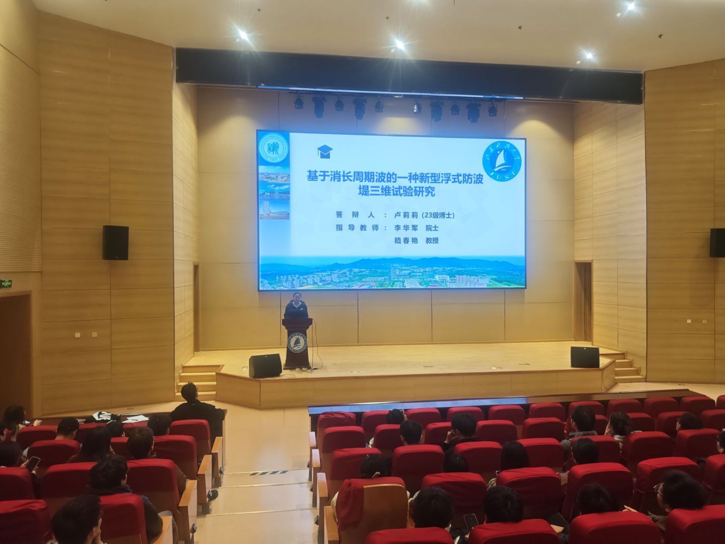 在学术汇报环节,武道磊同学聚焦船舶甲板海水飞沫对船舶安全与人员工作环境的影响难题,针对现有研究在海水飞沫形成机制、分布规律上的不足,采用观测拟合、简化推导、模型试验与数值模拟相结合的方法,深入研究海水飞沫的生成、运动及击水过程。卢莉莉同学聚焦浮式防波堤在实际波浪环境中的性能验证难题,通过布置六自由度测量系统、张力传感器等设备,详细设计3D防波堤试验的测点与装置,系统探究浮式防波堤的消波性能与运动响应。常明水同学聚焦新型双层薄板浮式防波堤的水动力特性分析难题,采用光滑粒子流体动力学(SPH)方法,对该新型浮式防波堤开展数值模拟研究,探究其在波浪作用下的水动力响应规律。帅华飞同学研究针对无人水面艇(USV)近距离制导回收的技术难题,创新提出增强跨尺度目标检测网(ECO-DETR)与双视觉互补制导律(DVCGL),同时构建了多源数据融合的USV回收专用数据集,填补了公开数据集稀缺的空白。邬梦怡同学研究聚焦低速重载、起停混合润滑工况下滑动轴承的摩擦学性能优化难题,采用激光纹理化与紫外固化相结合的先进工艺,在滑动轴承表面精准制备出嵌入复合固体润滑剂的特殊润滑结构。
